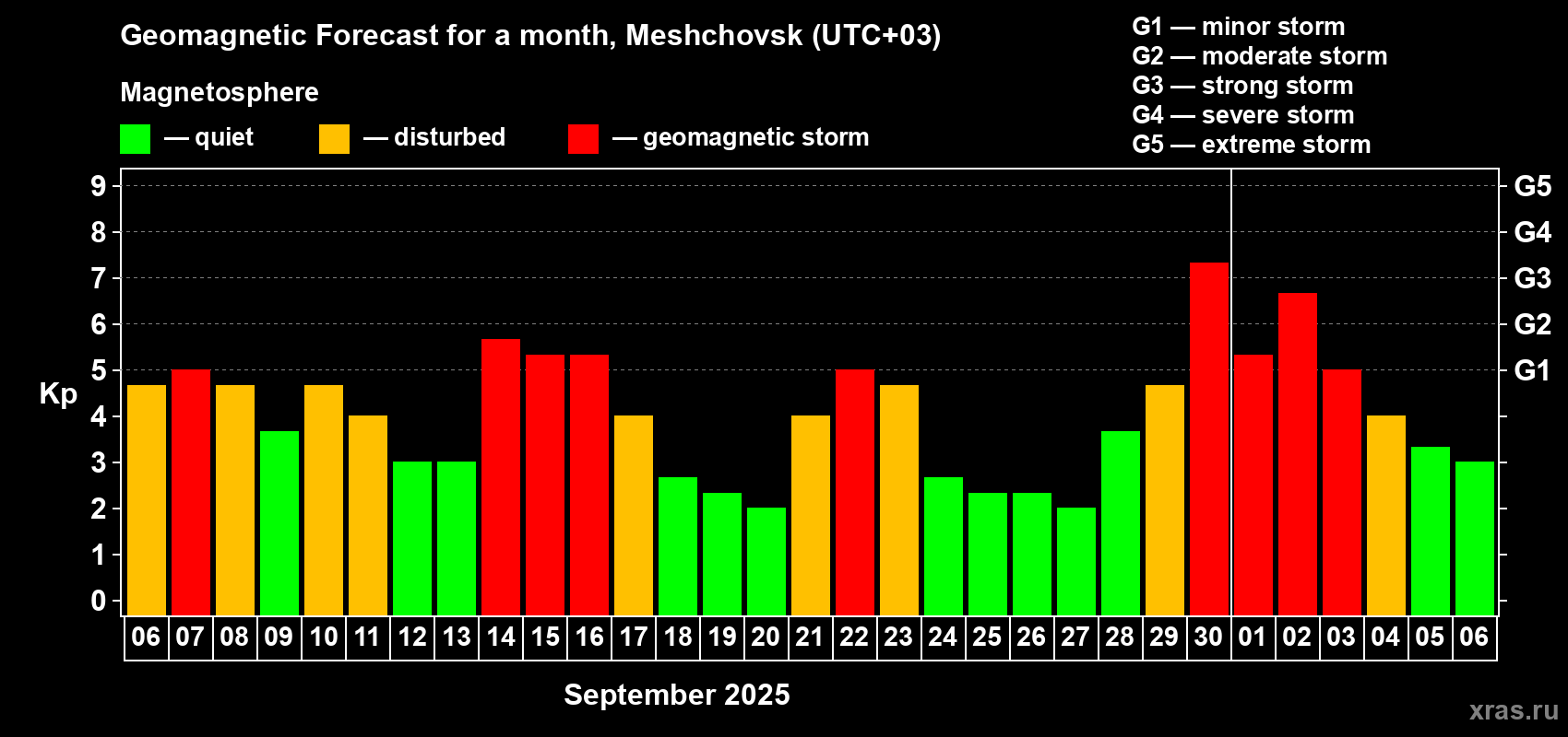 Geomagnetic storm forecast in Meshchovsk for Sep 06, 2025