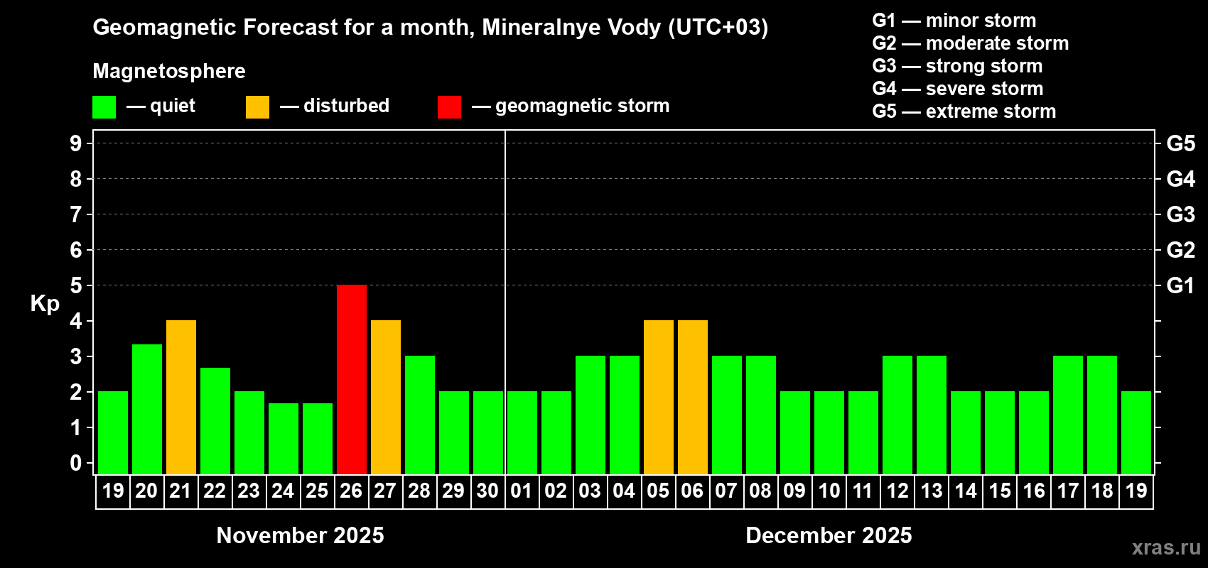 Geomagnetic storm forecast in Mineralnye Vody for Nov 19, 2025
