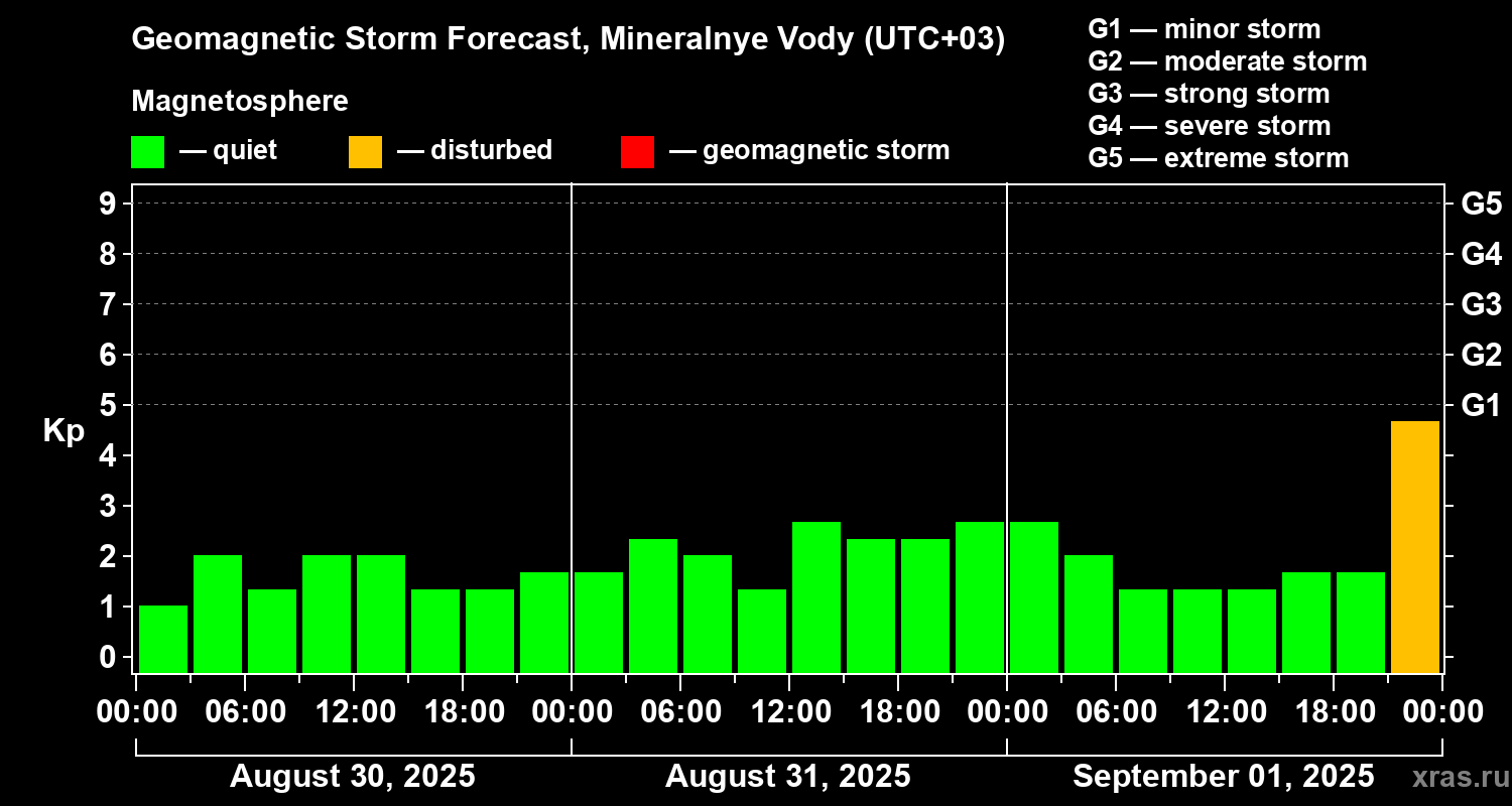 Geomagnetic storm forecast in Mineralnye Vody for Aug 30, 2025