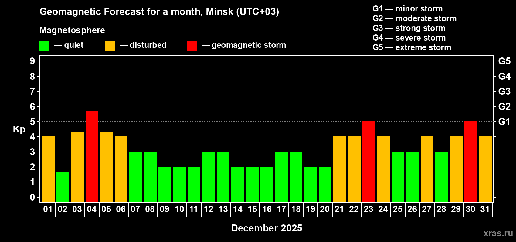 Geomagnetic storm forecast in Minsk for Dec 01, 2025