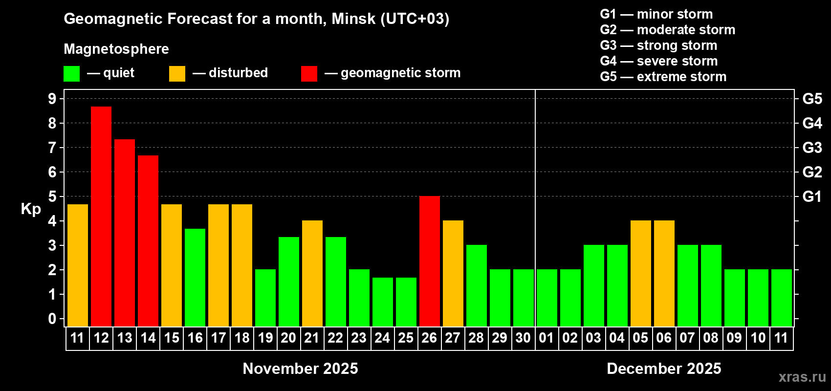 Geomagnetic storm forecast in Minsk for Nov 11, 2025