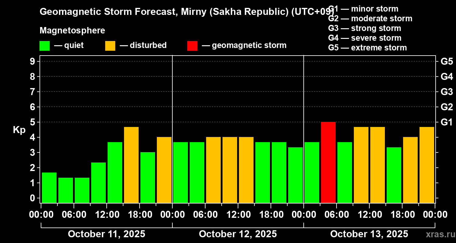 Geomagnetic storm forecast in Mirny (Sakha Republic) for Oct 11, 2025
