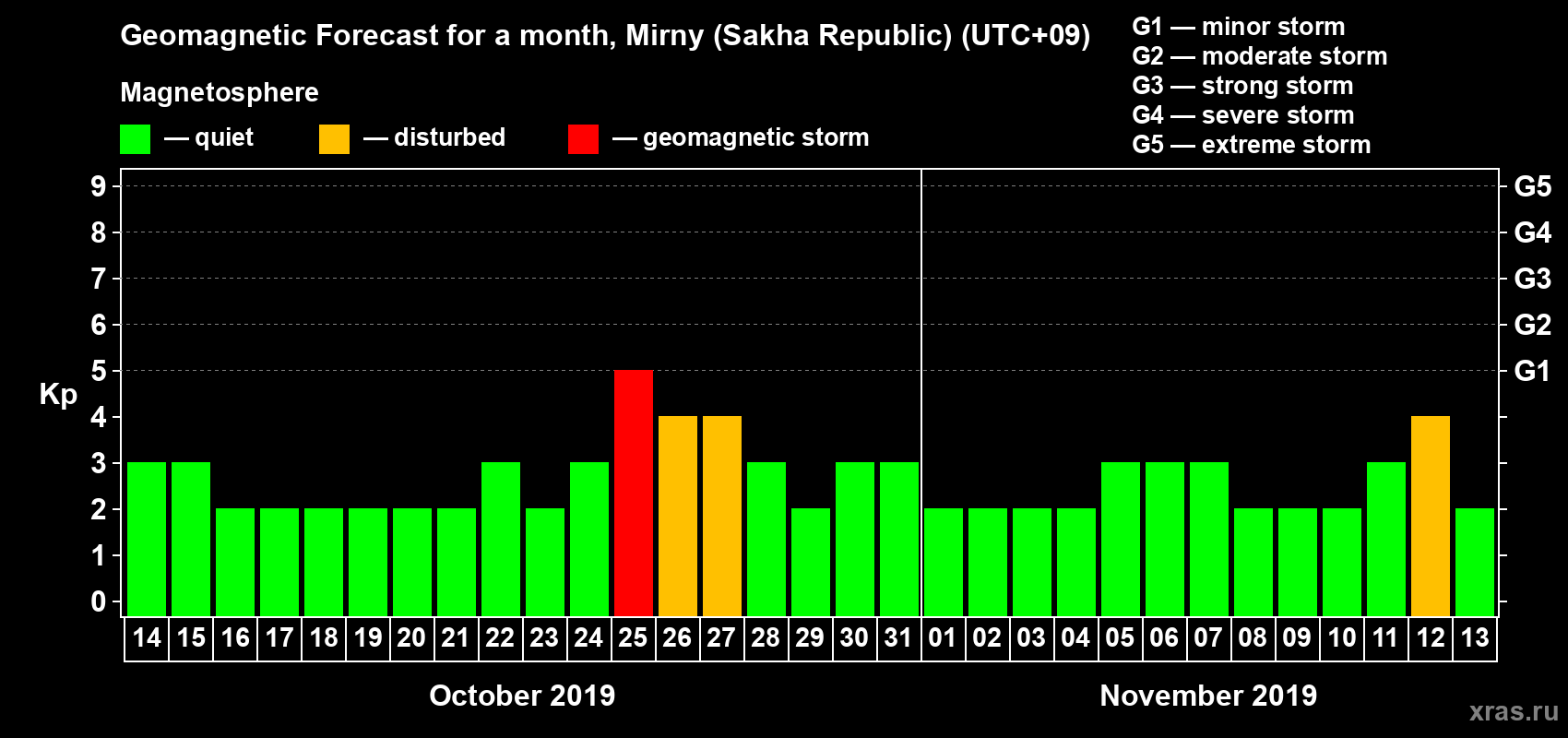 Geomagnetic storm forecast in Mirny (Sakha Republic) for Oct 14, 2019