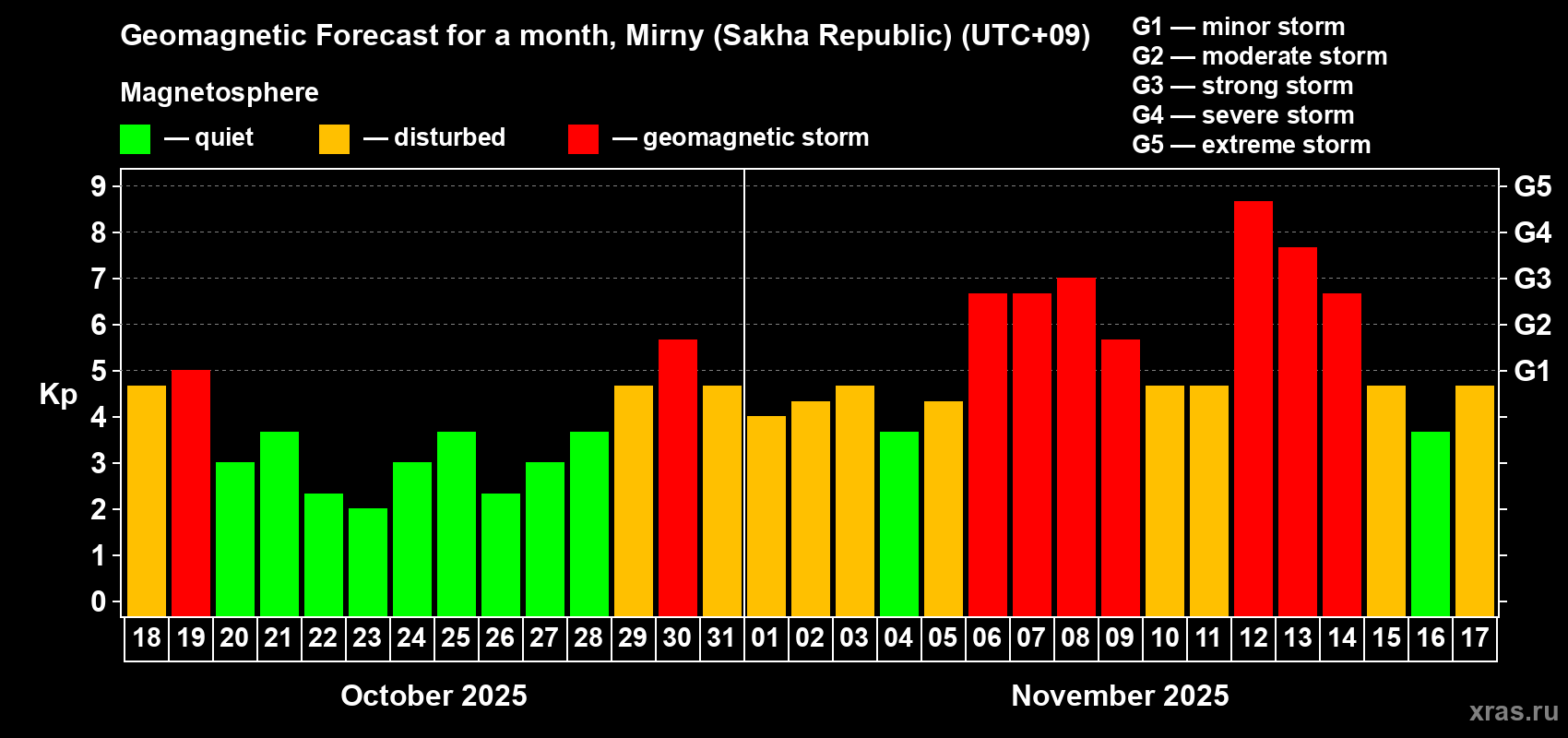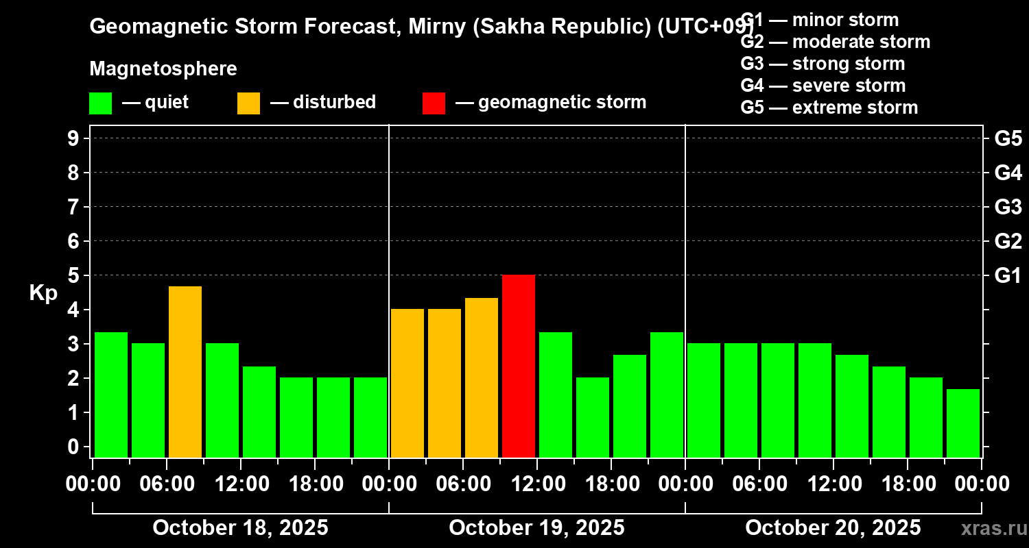 Geomagnetic storm forecast in Mirny (Sakha Republic) for Oct 18, 2025