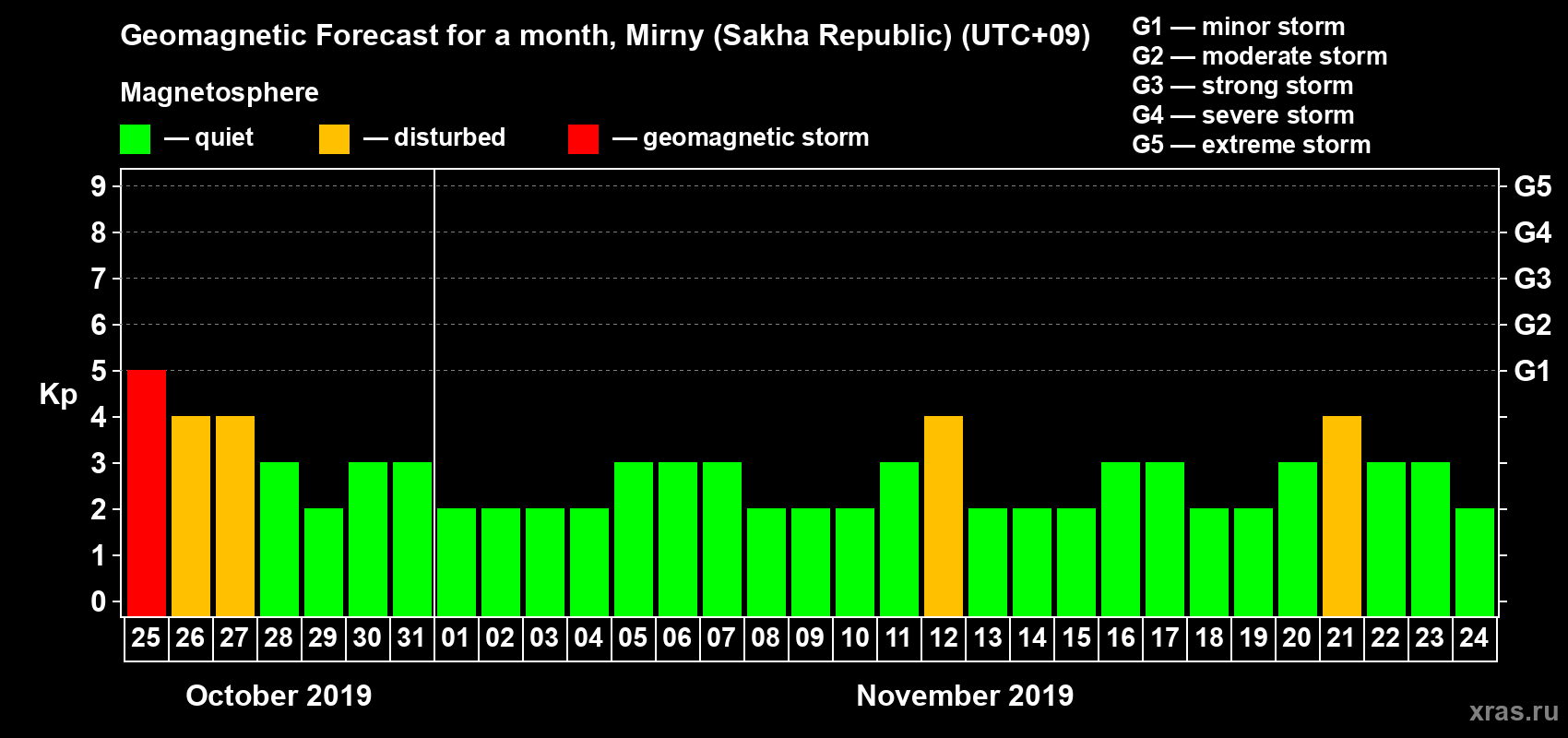 Geomagnetic storm forecast in Mirny (Sakha Republic) for Oct 25, 2019