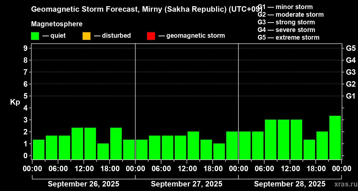 Geomagnetic activity forecast in Mirny (Sakha Republic) — Sep 26, 2025