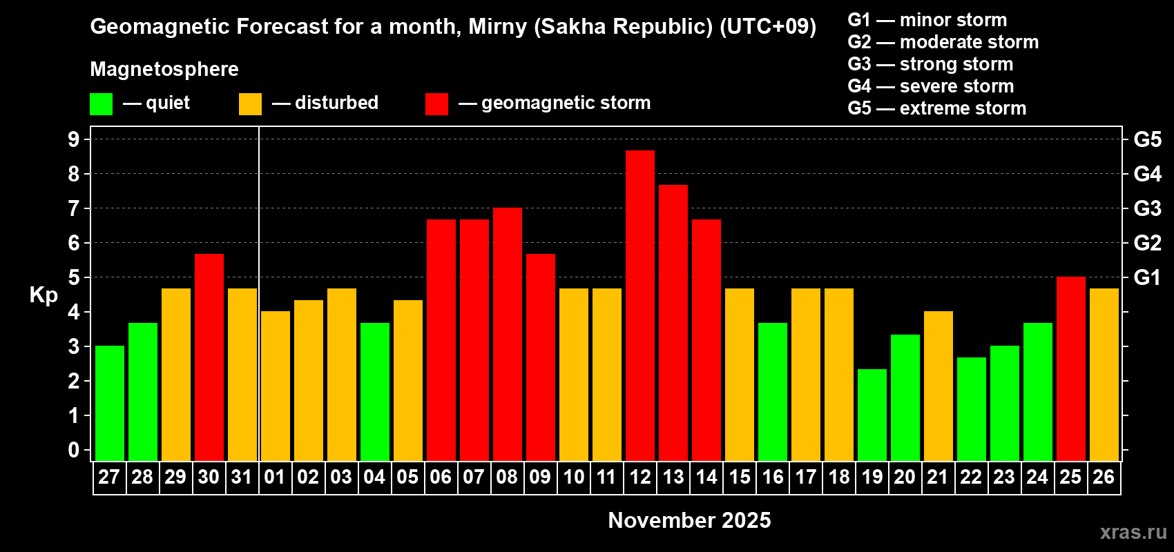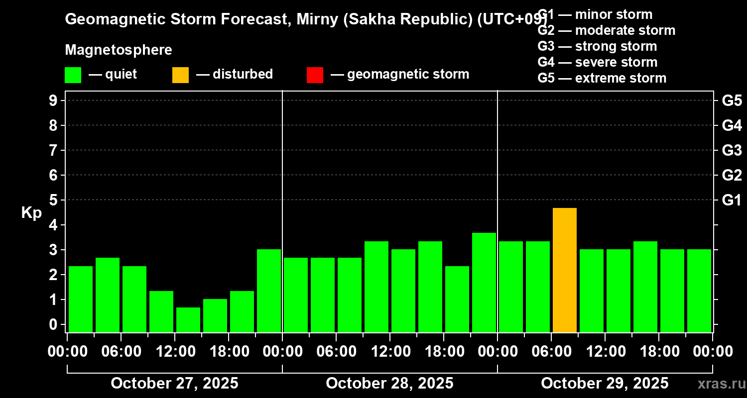 Geomagnetic storm forecast in Mirny (Sakha Republic) for Oct 27, 2025