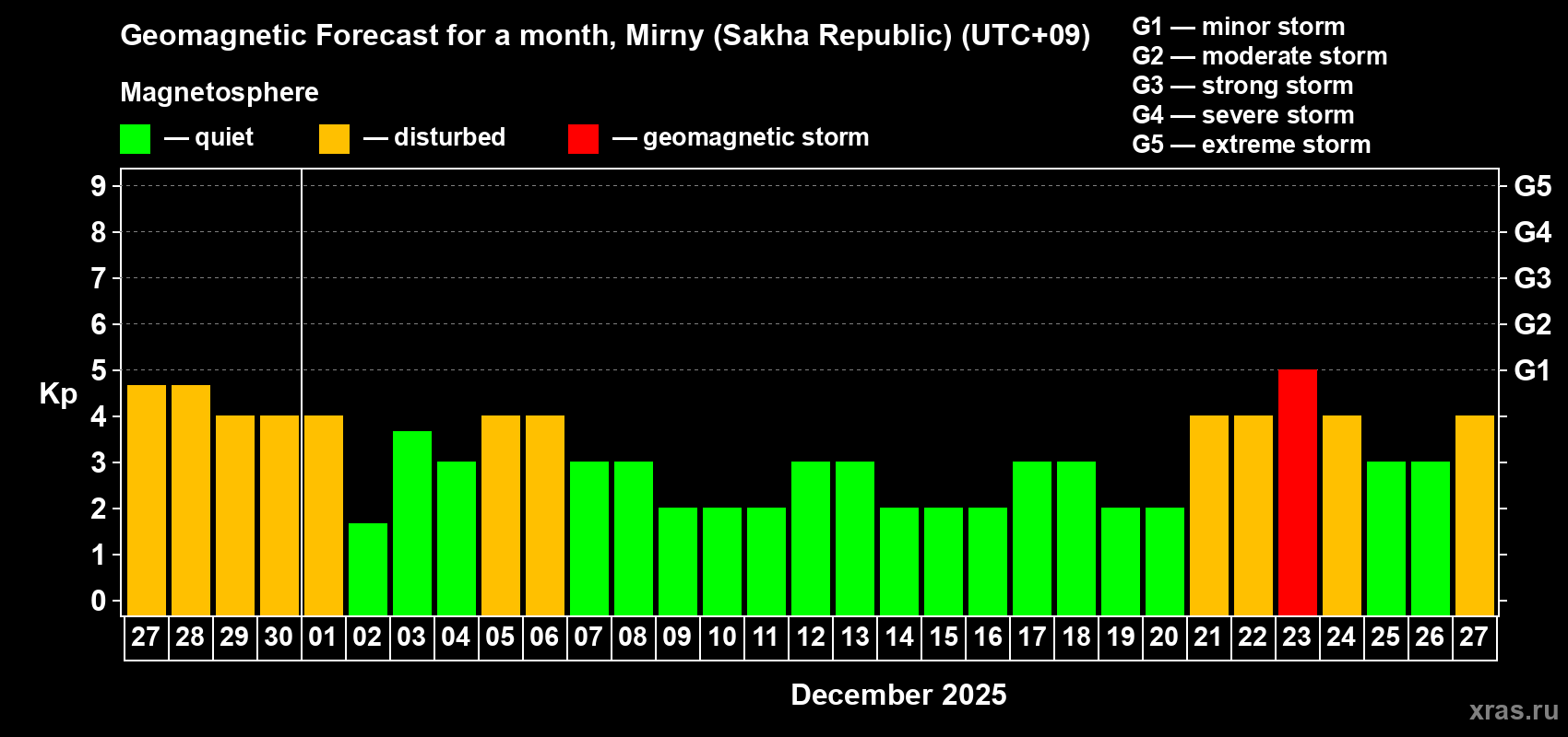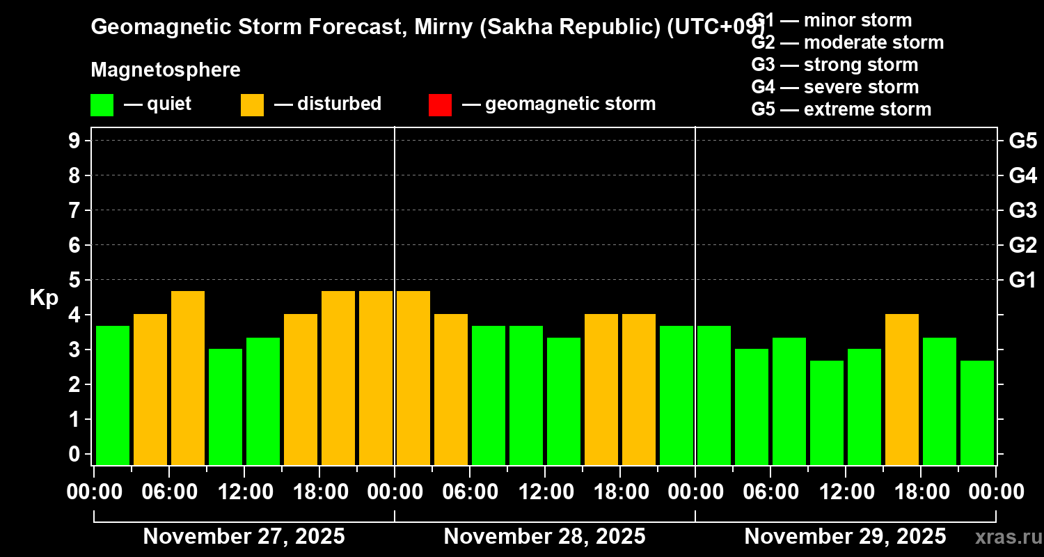 Geomagnetic storm forecast in Mirny (Sakha Republic) for Nov 27, 2025
