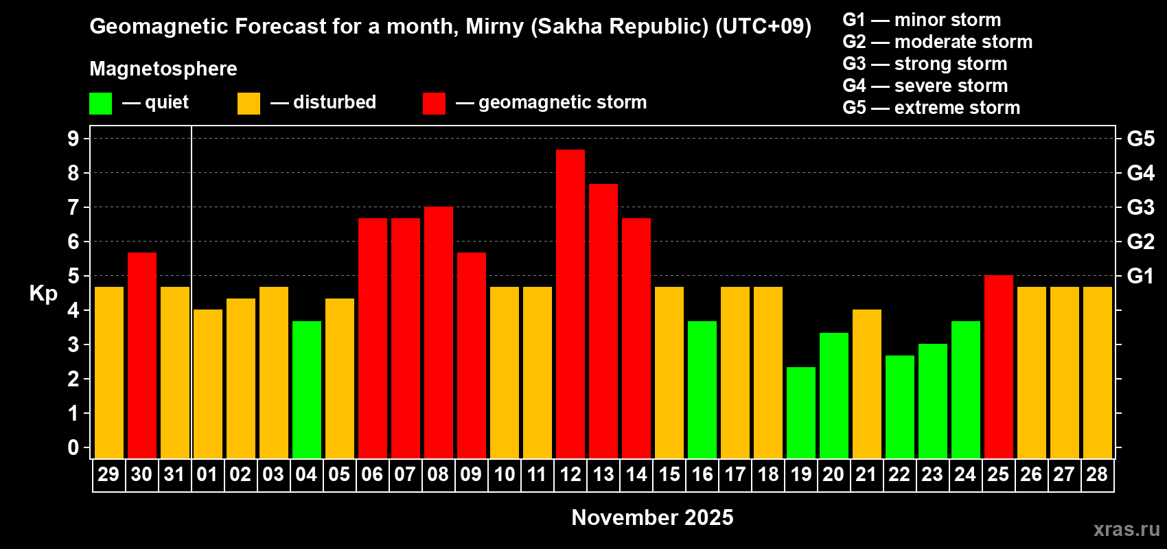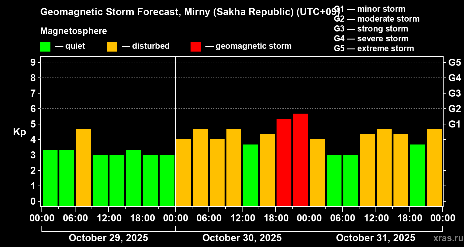 Geomagnetic storm forecast in Mirny (Sakha Republic) for Oct 29, 2025