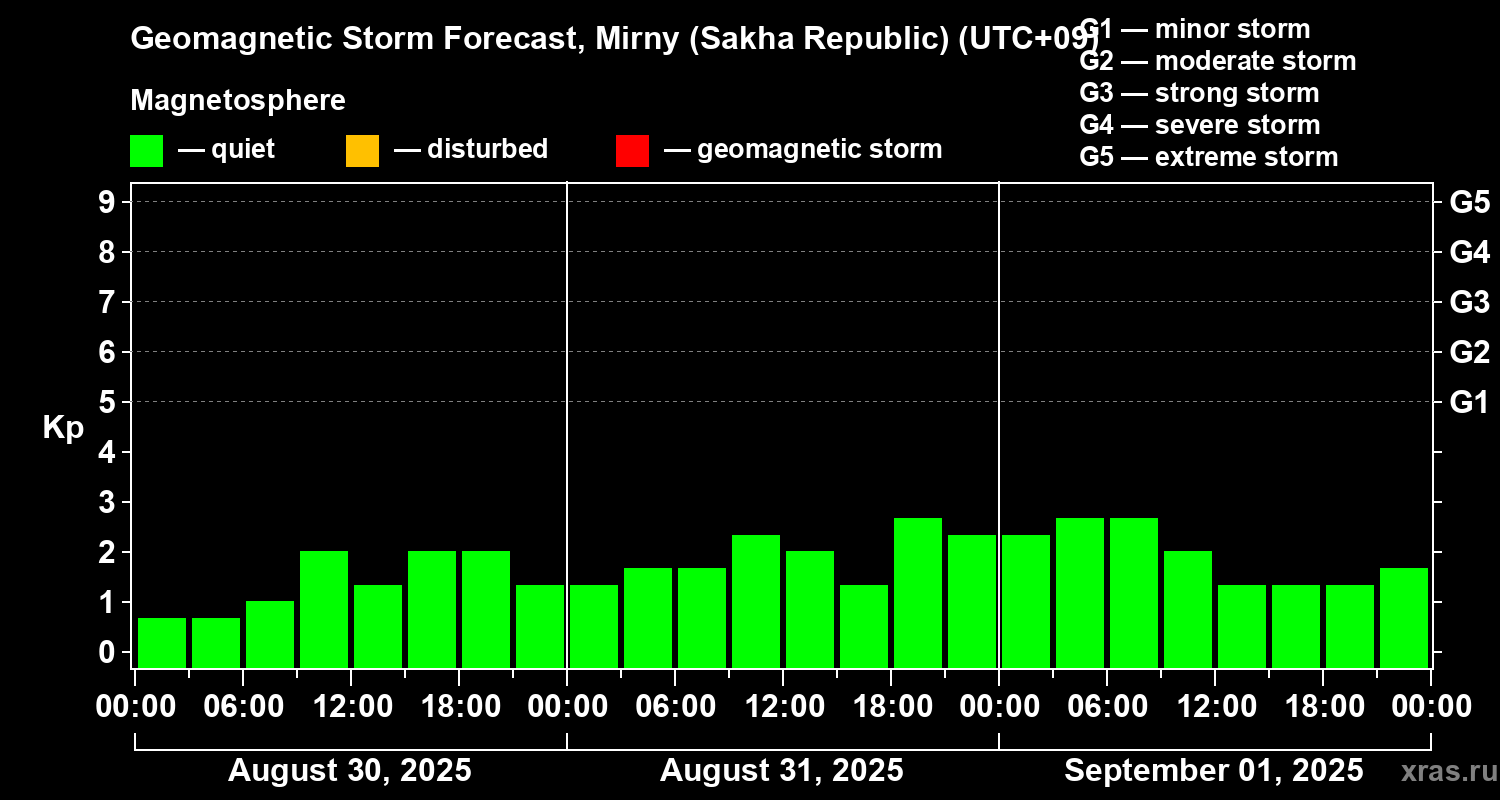 Geomagnetic storm forecast in Mirny (Sakha Republic) for Aug 30, 2025