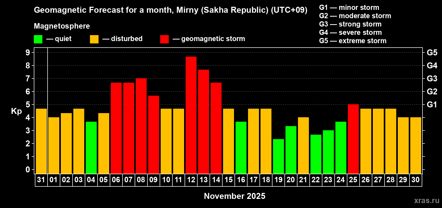 Geomagnetic storm forecast in Mirny (Sakha Republic) for Oct 31, 2025