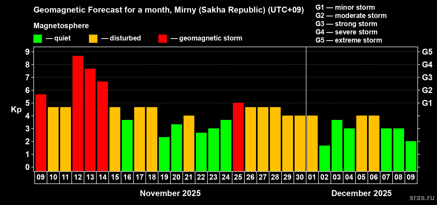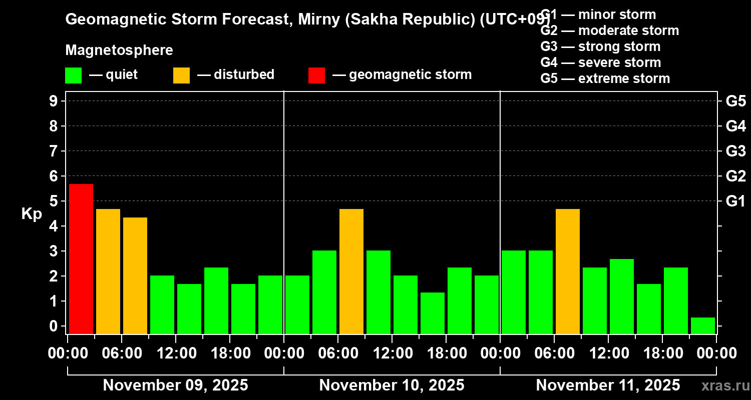Geomagnetic storm forecast in Mirny (Sakha Republic) for Nov 09, 2025