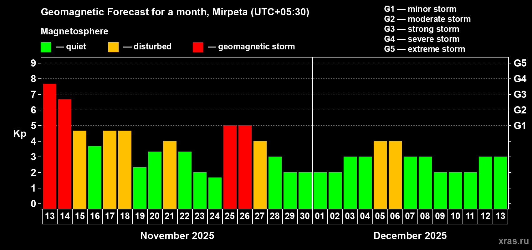 Geomagnetic storm forecast in Mirpeta for Nov 13, 2025