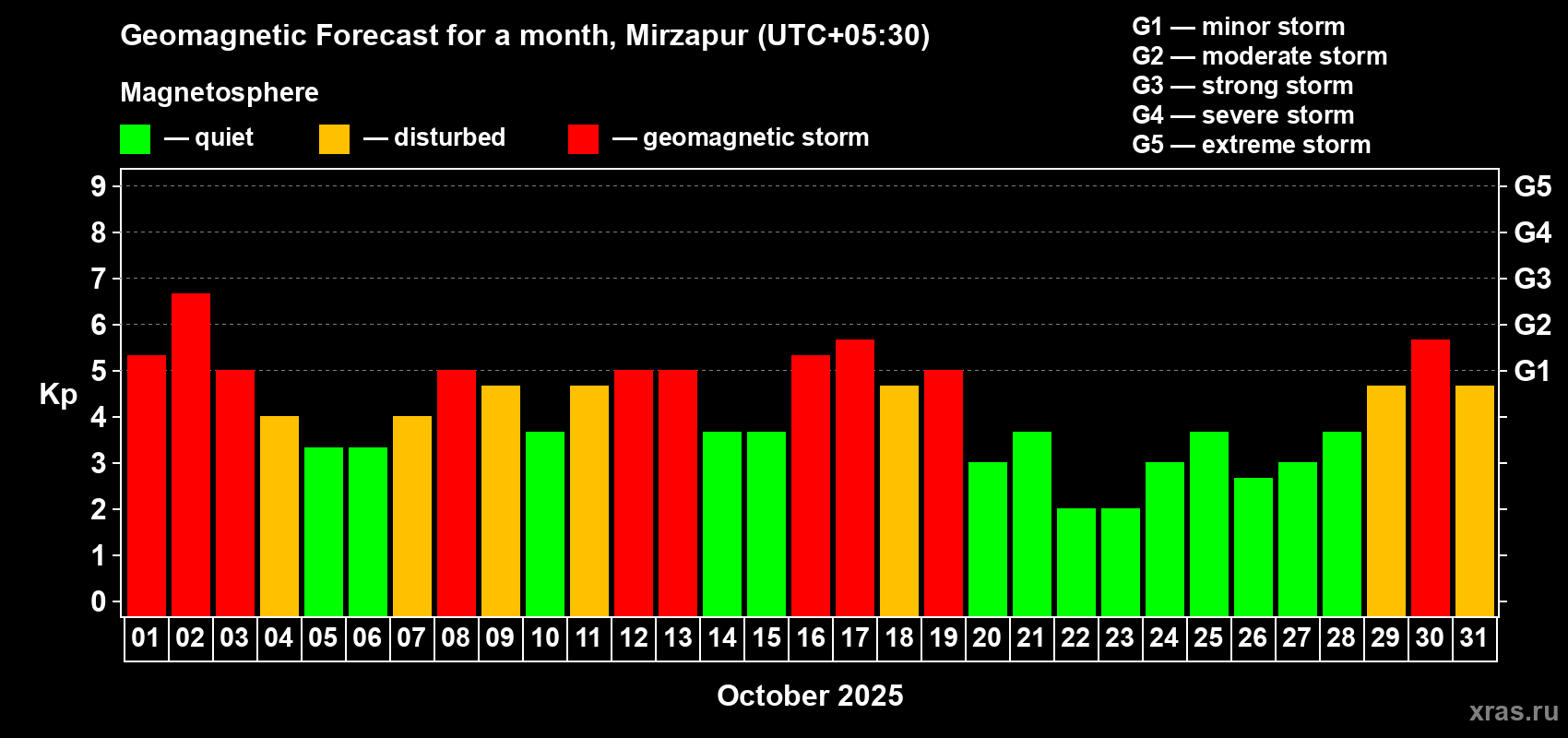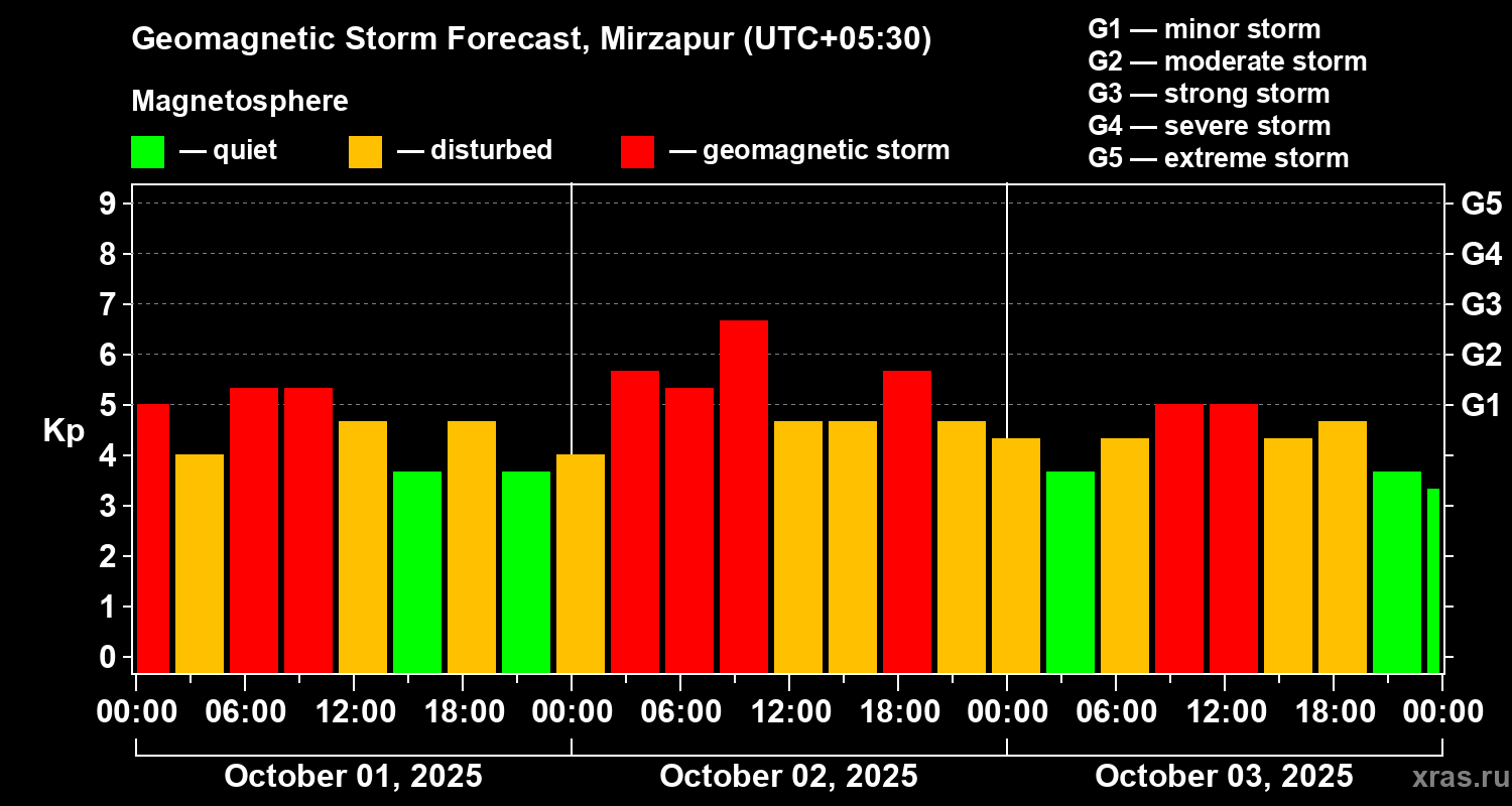 Geomagnetic storm forecast in Mirzapur for Oct 01, 2025