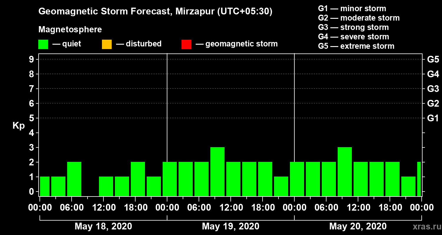 Geomagnetic storm forecast in Mirzapur for May 18, 2020