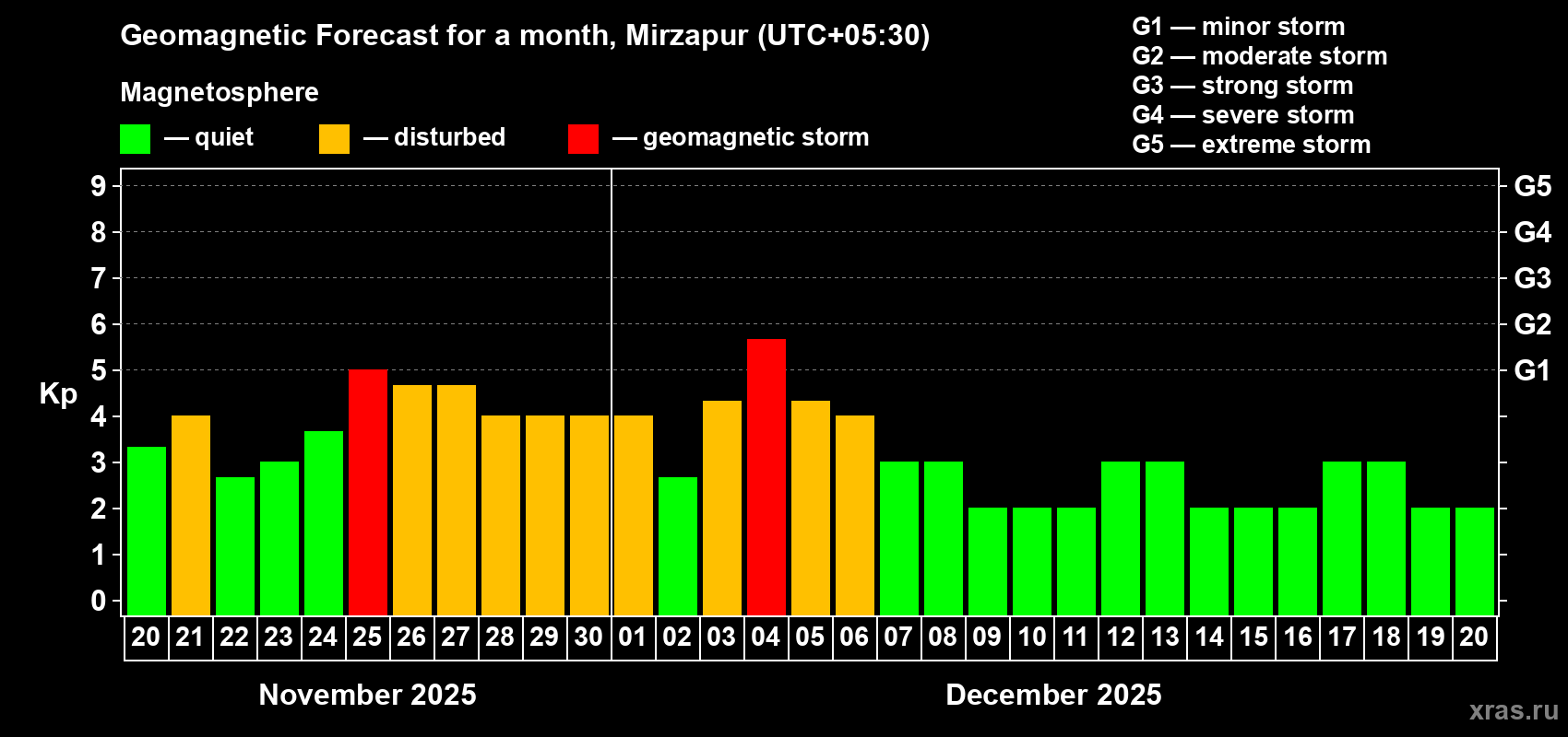 Geomagnetic storm forecast in Mirzapur for Nov 20, 2025