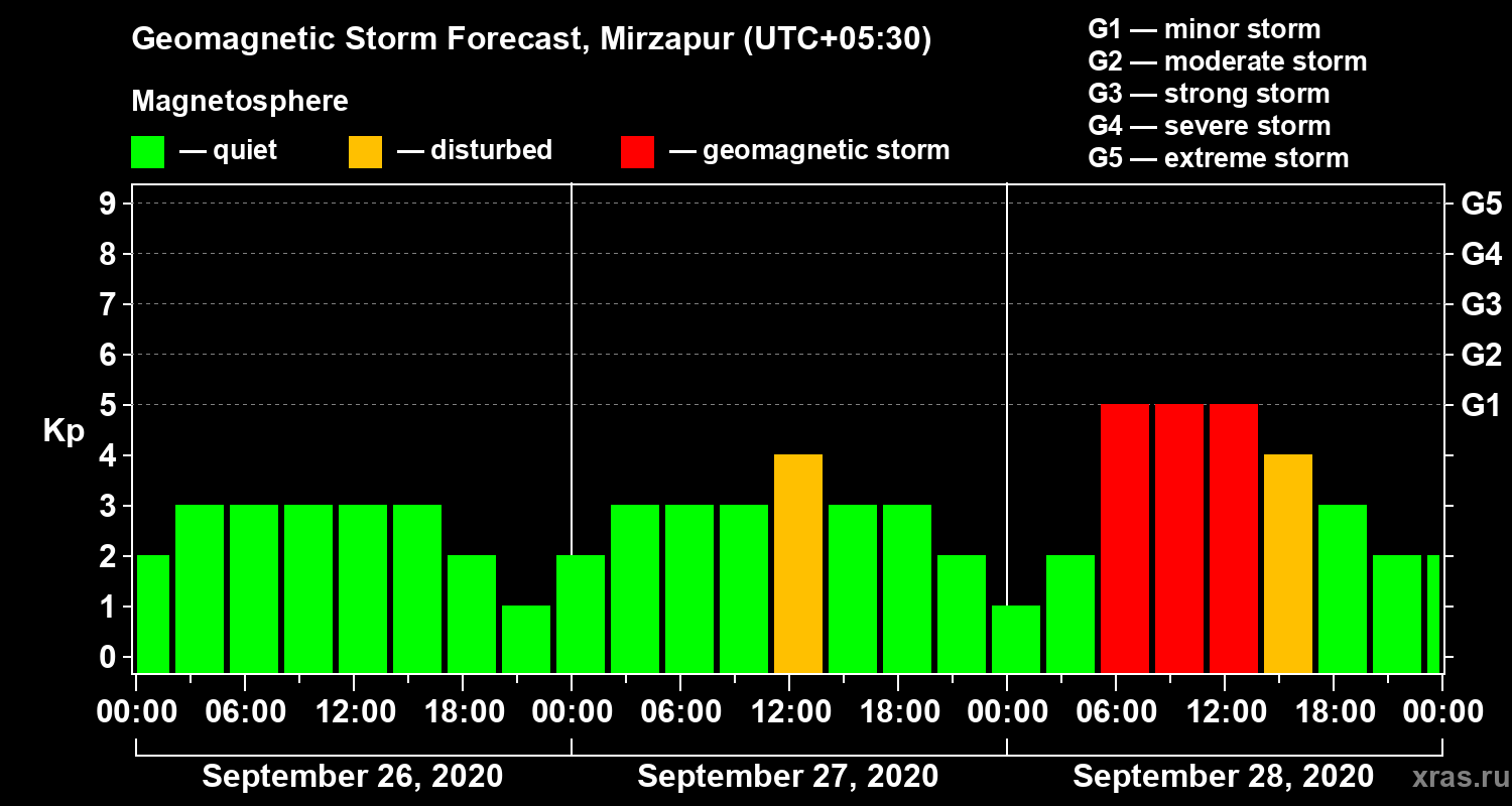 Geomagnetic storm forecast in Mirzapur for Sep 26, 2020