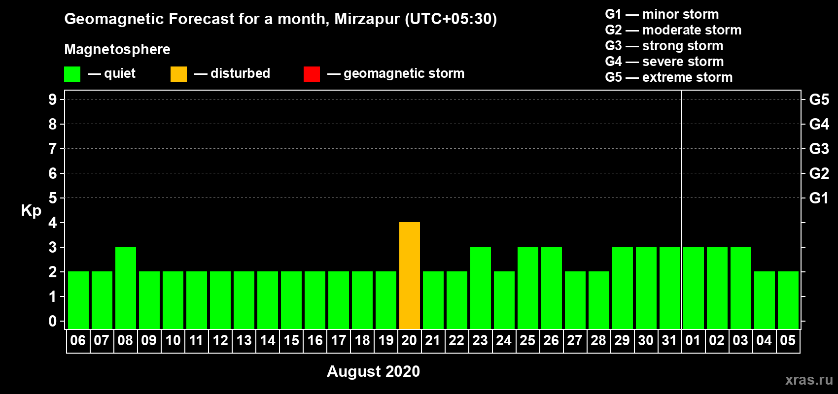 Geomagnetic storm forecast in Mirzapur for Aug 06, 2020