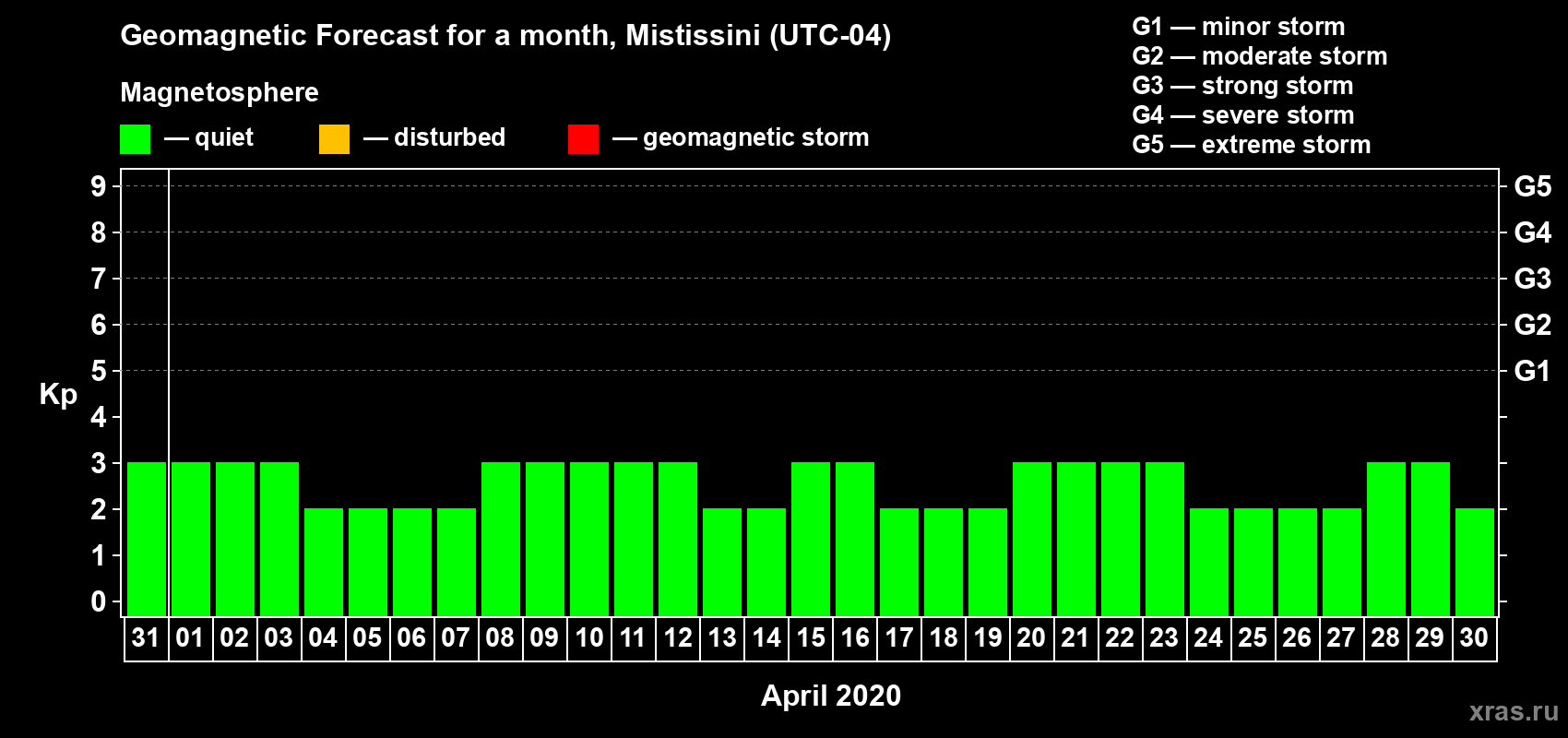 Geomagnetic storm forecast in Mistissini for Mar 31, 2020