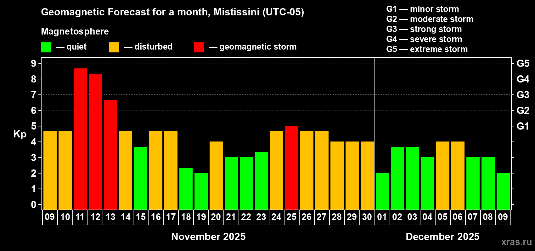 Geomagnetic storm forecast in Mistissini for Nov 09, 2025