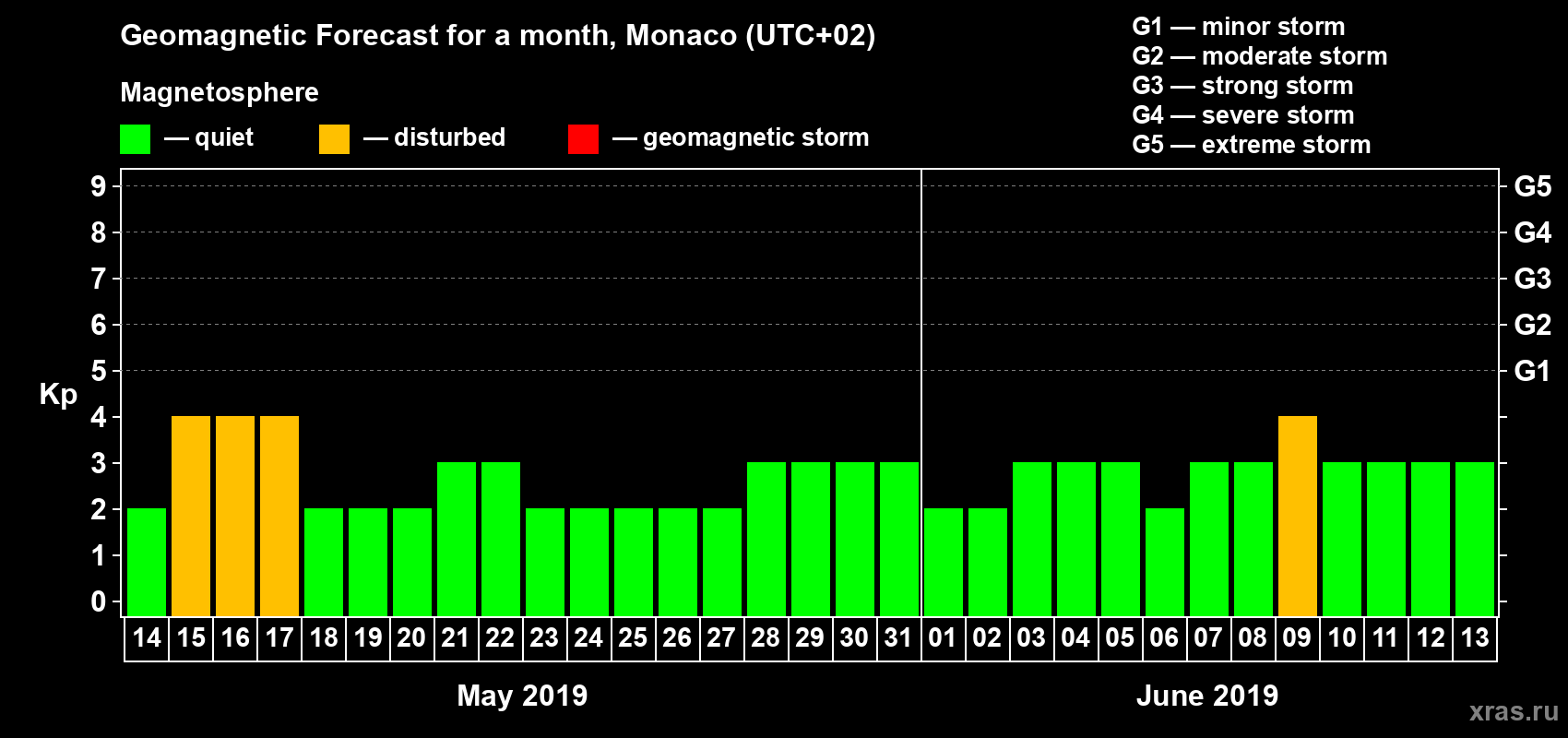 Geomagnetic storm forecast in Monaco for May 14, 2019