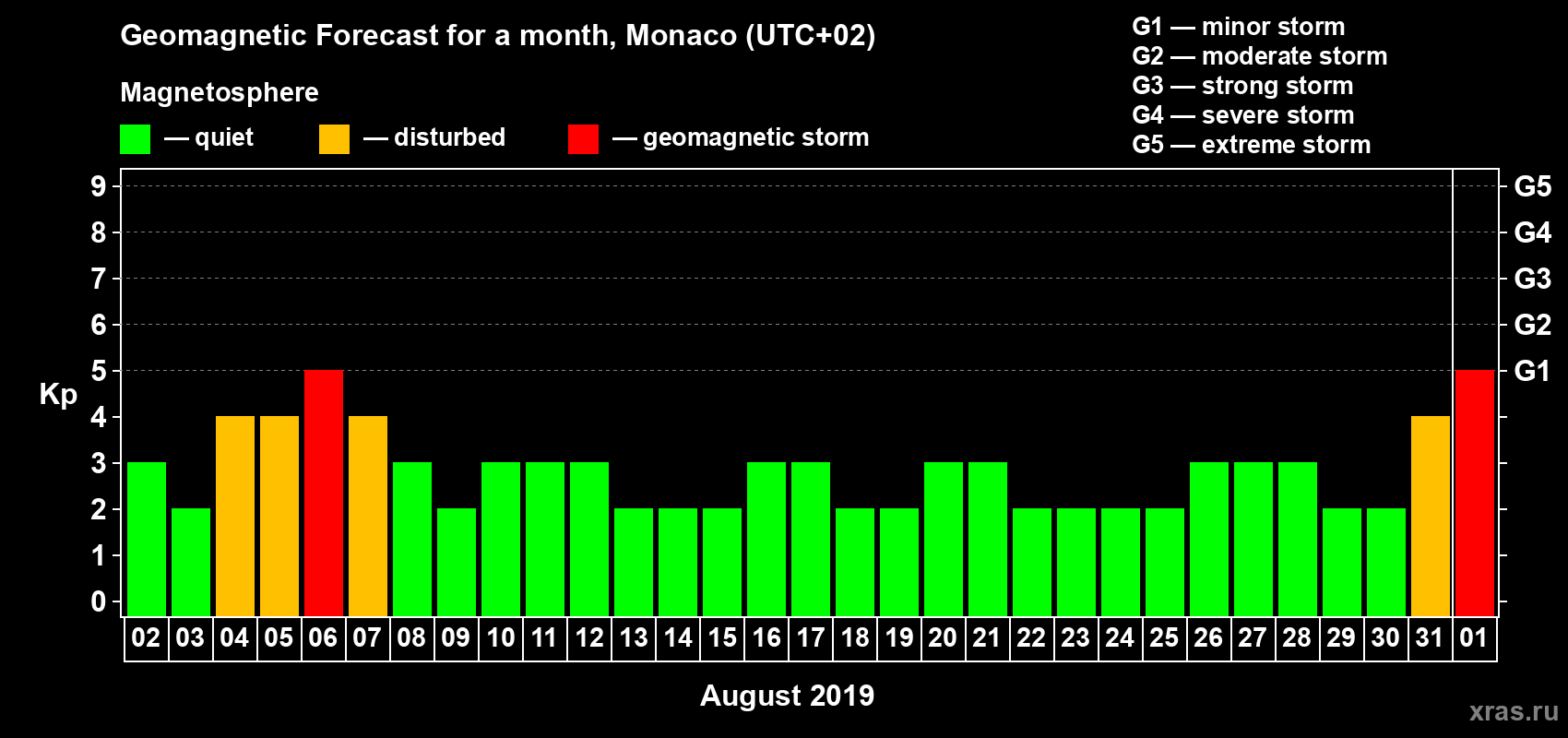 Geomagnetic storm forecast in Monaco for Aug 02, 2019