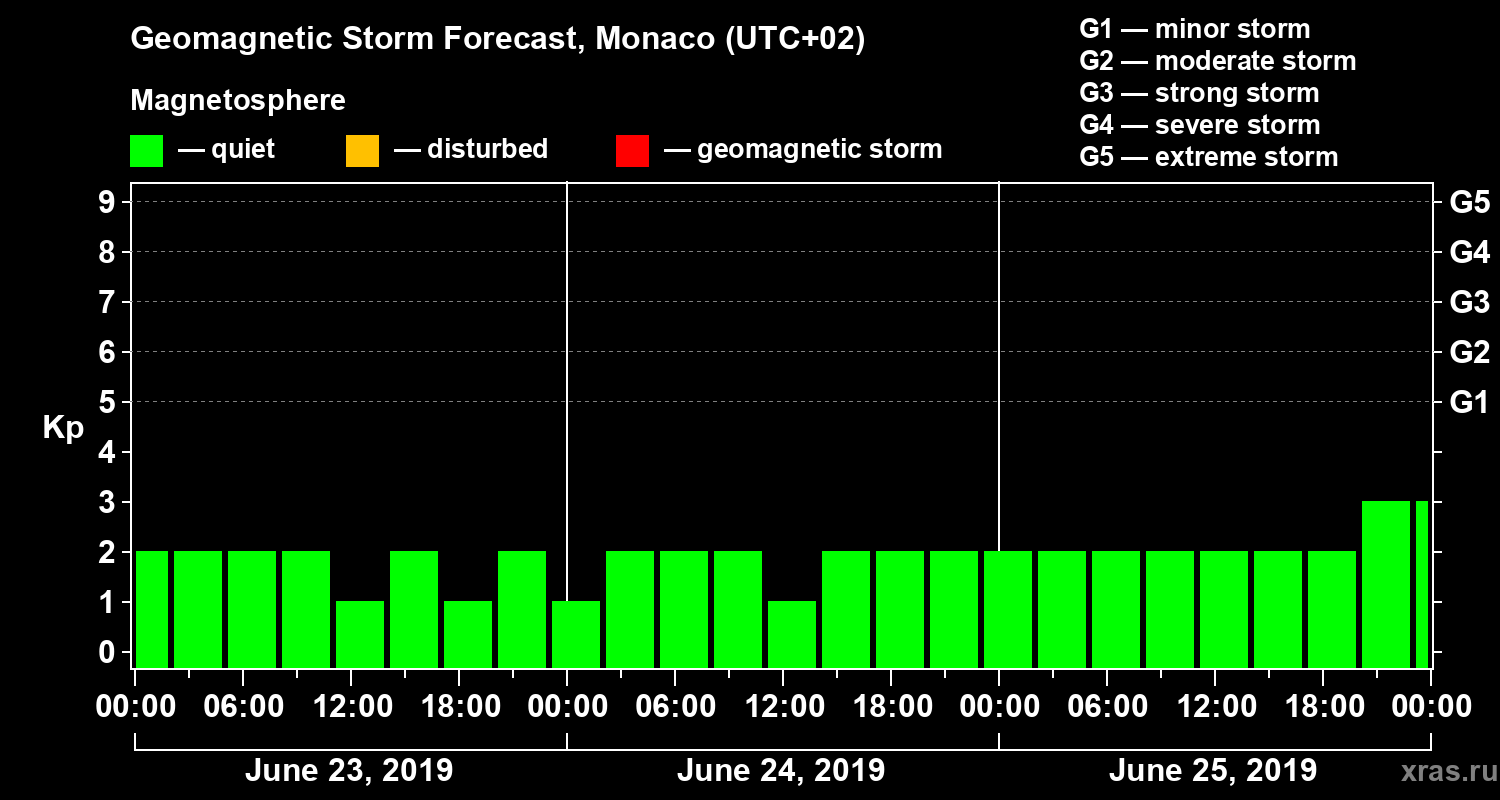 Geomagnetic storm forecast in Monaco for Jun 23, 2019