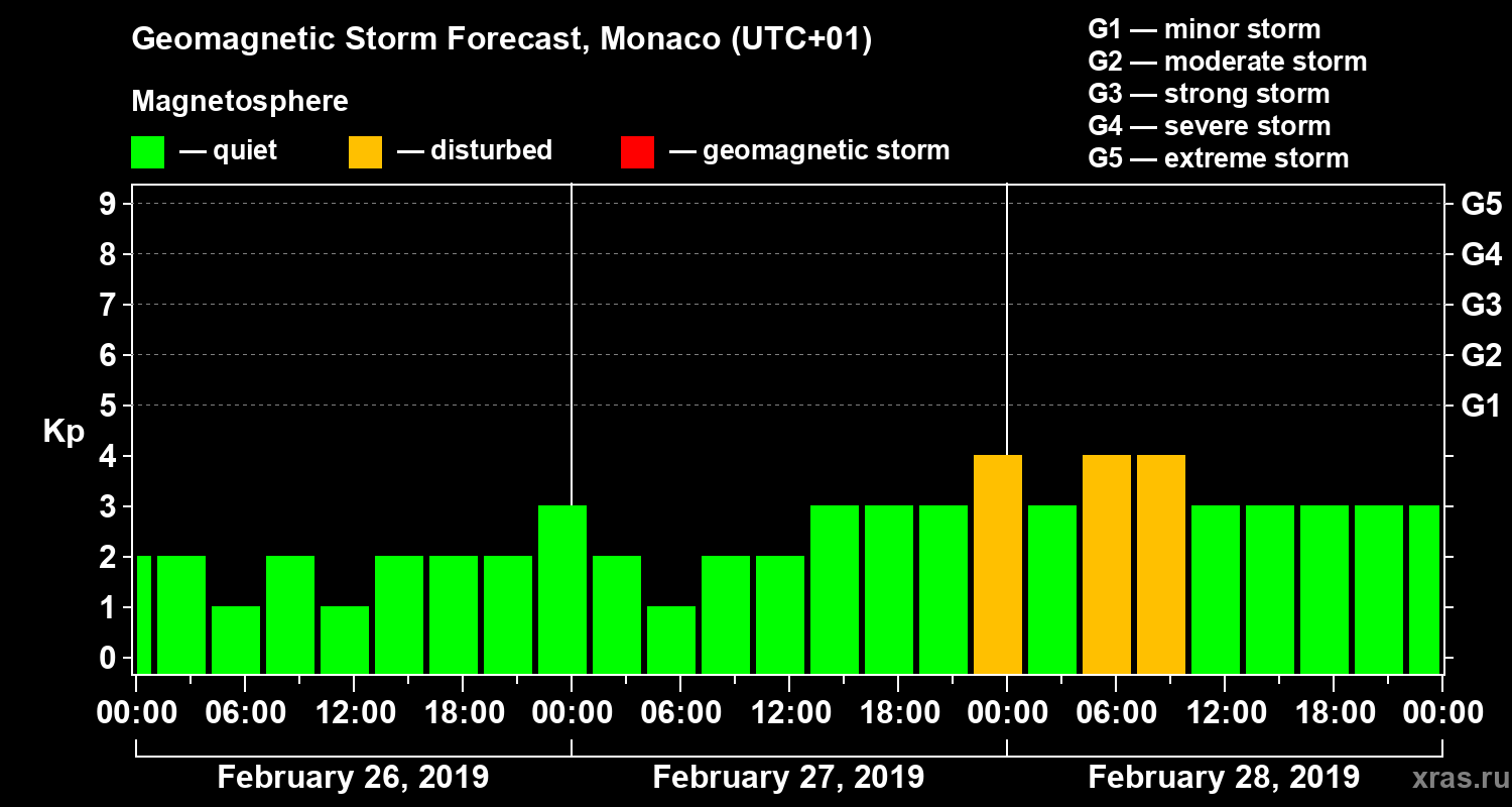 Geomagnetic storm forecast in Monaco for Feb 26, 2019
