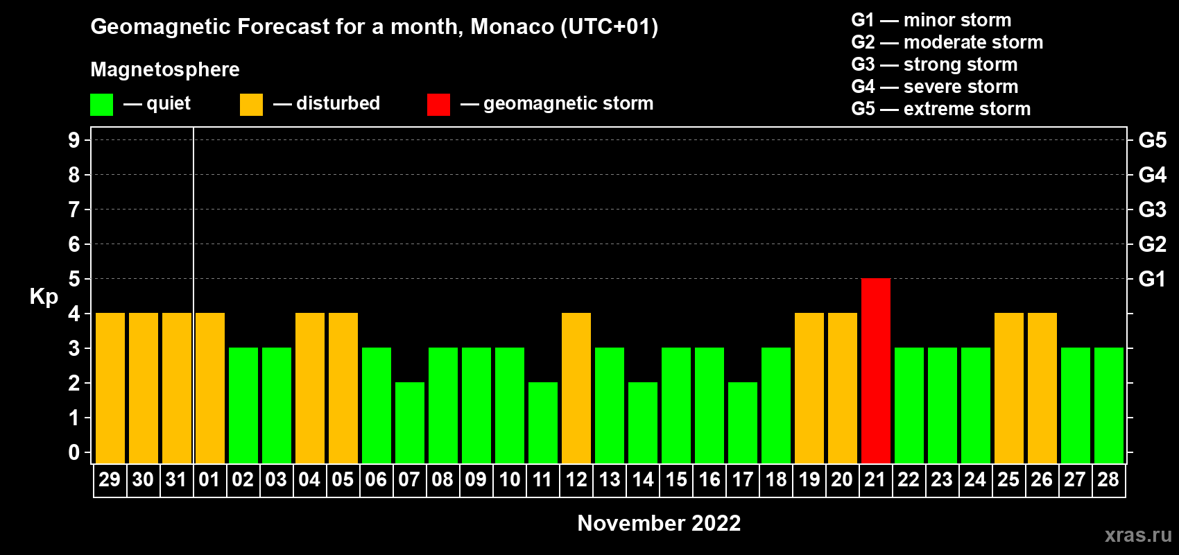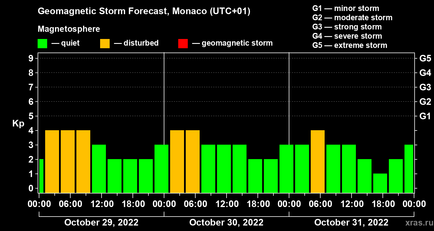 Geomagnetic storm forecast in Monaco for Oct 29, 2022