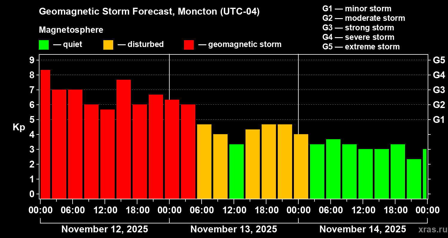 Geomagnetic storm forecast in Moncton for Nov 12, 2025