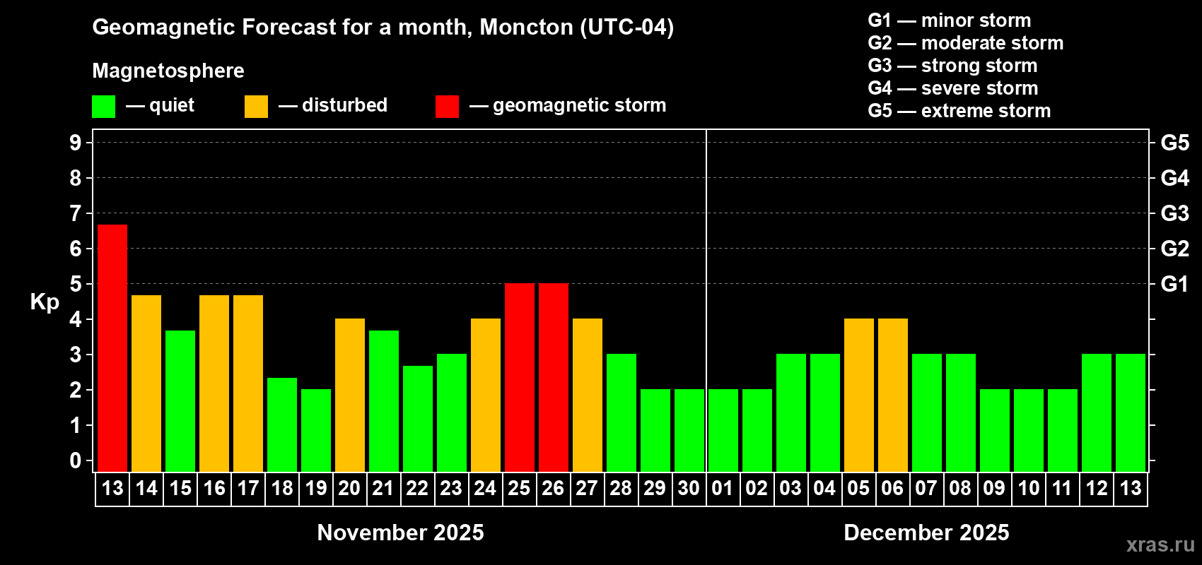 Geomagnetic storm forecast in Moncton for Nov 13, 2025