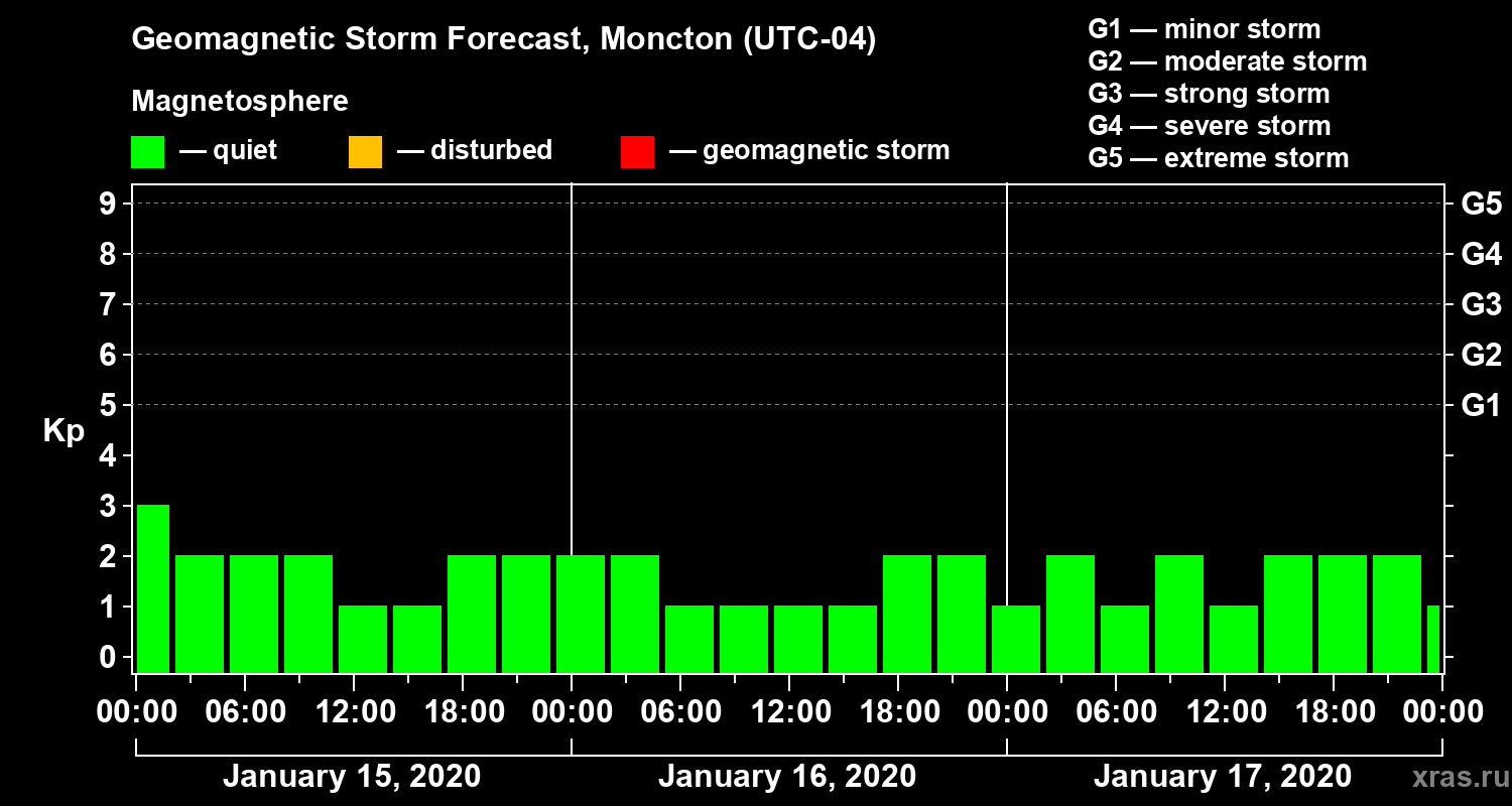 Geomagnetic storm forecast in Moncton for Jan 15, 2020