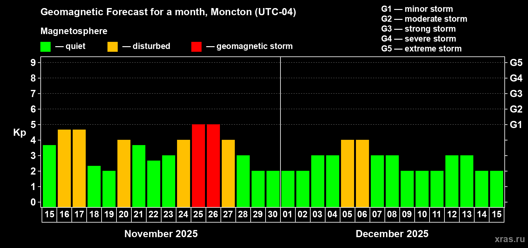 Geomagnetic storm forecast in Moncton for Nov 15, 2025