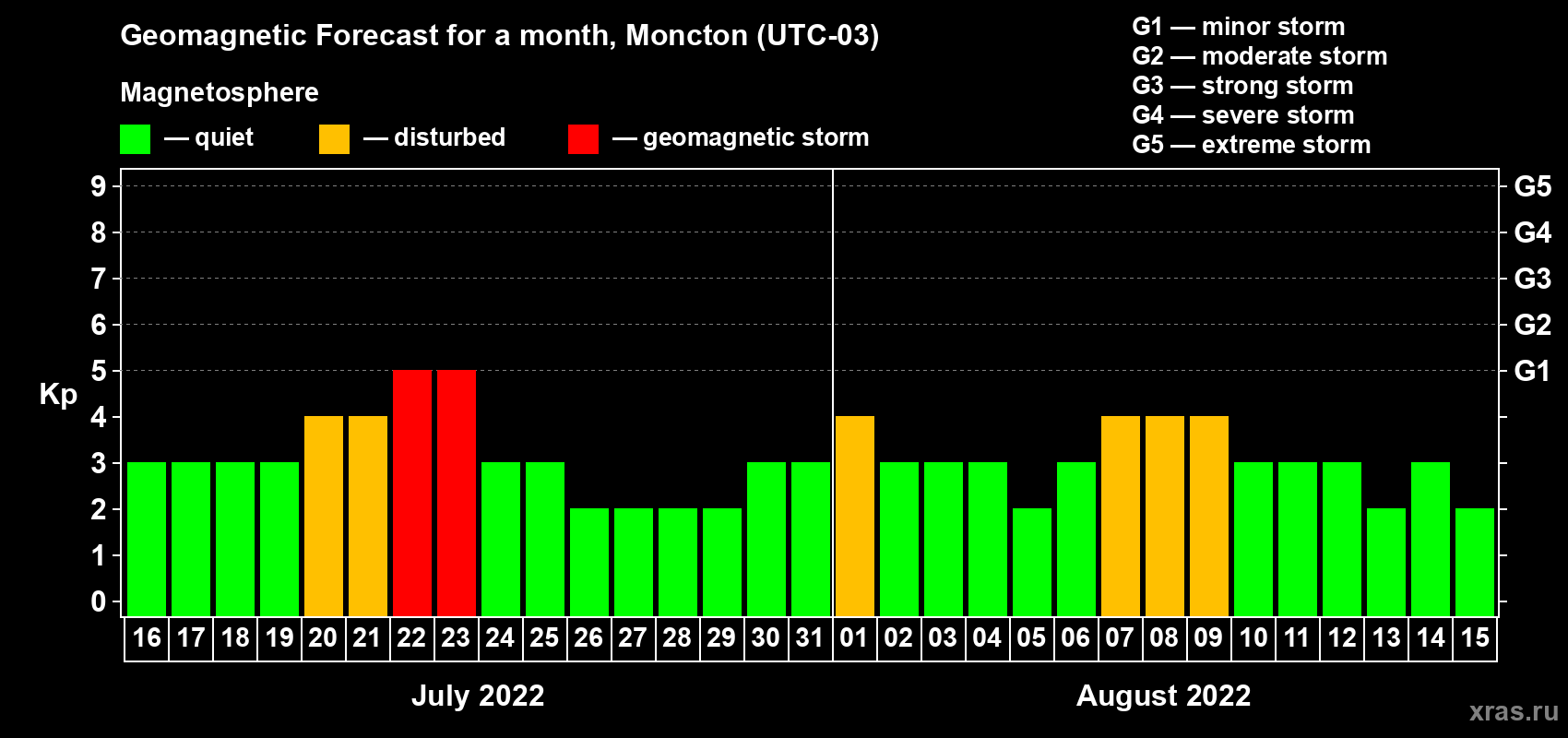 Geomagnetic storm forecast in Moncton for Jul 16, 2022