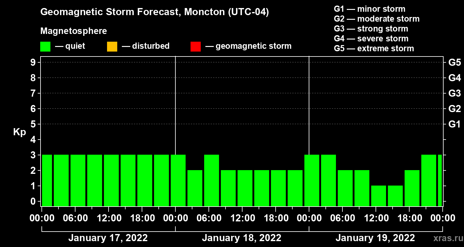 Geomagnetic storm forecast in Moncton for Jan 17, 2022