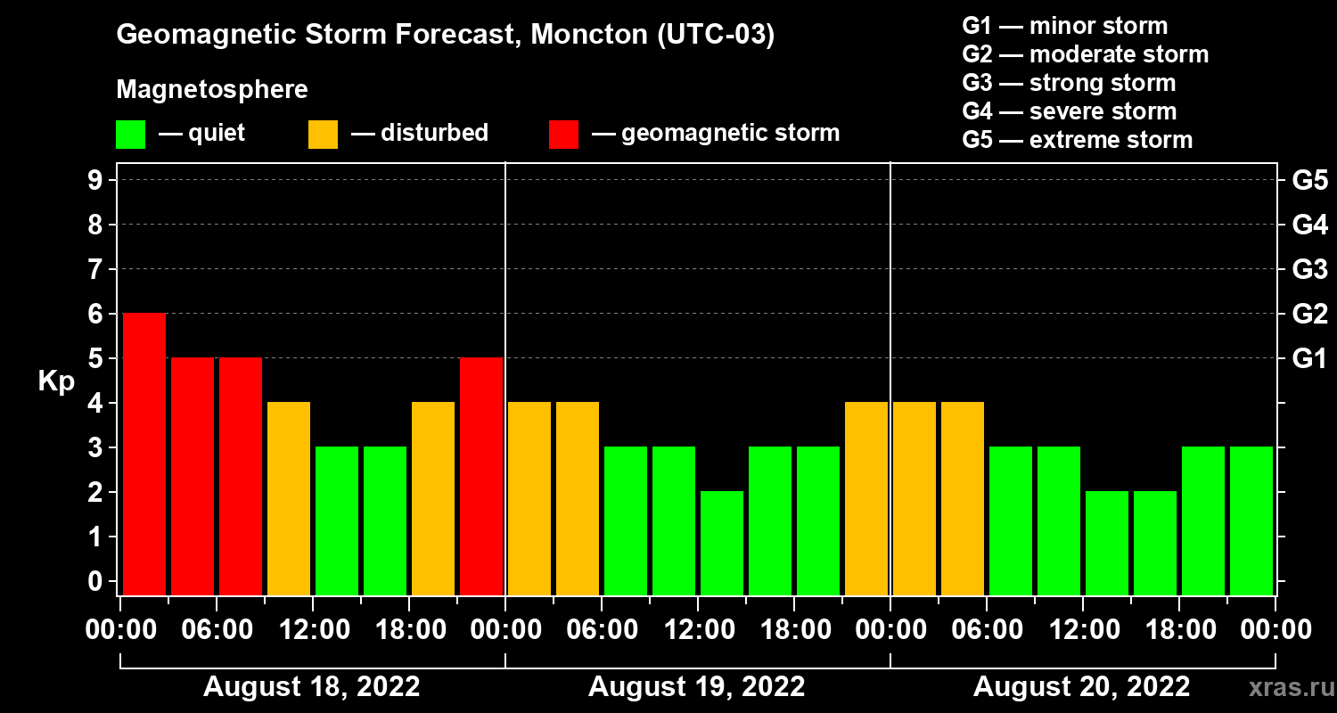 Geomagnetic storm forecast in Moncton for Aug 18, 2022