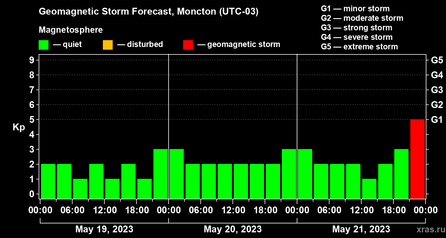 Geomagnetic storm forecast in Moncton for May 19, 2023