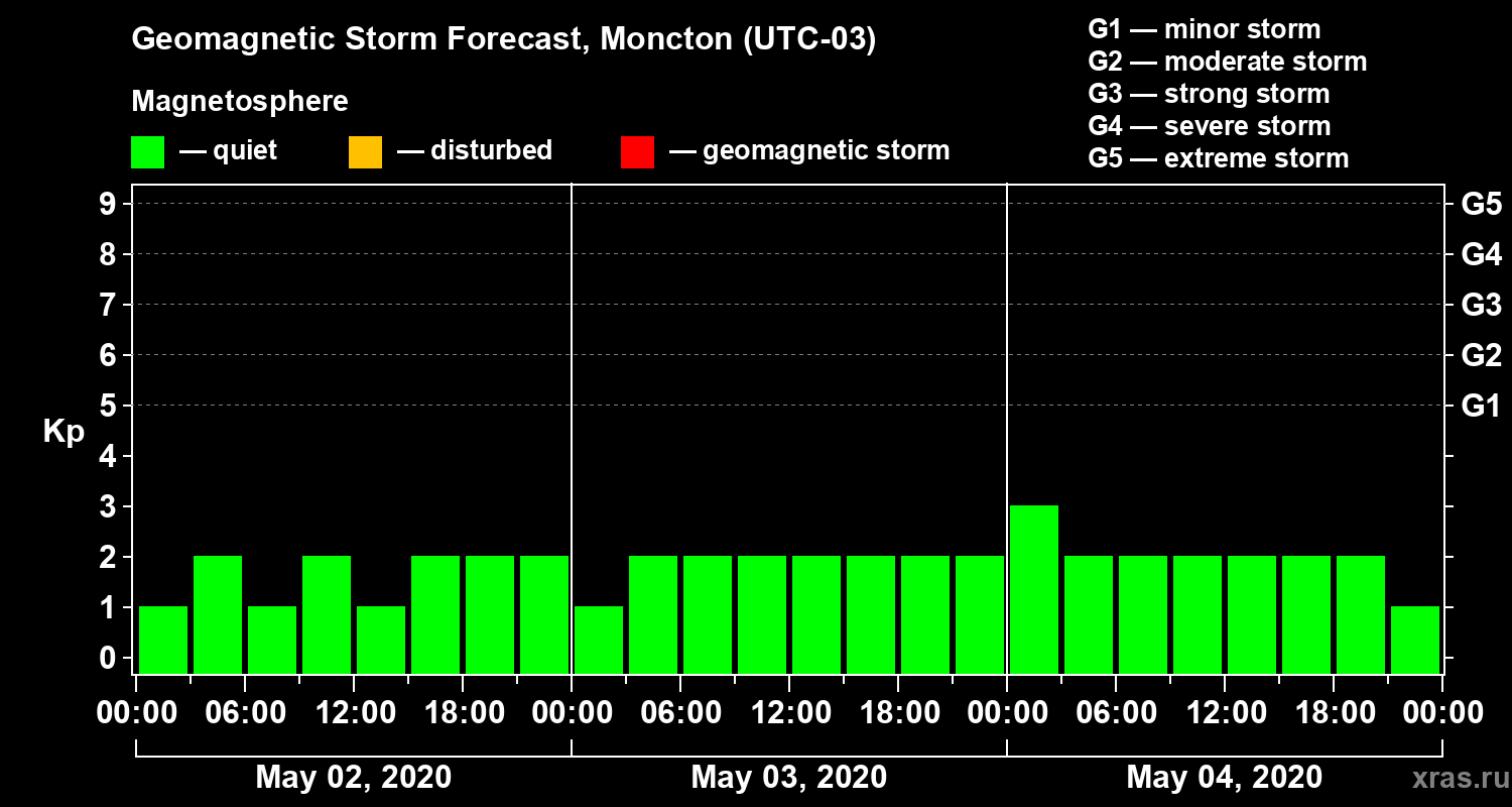 Geomagnetic storm forecast in Moncton for May 02, 2020