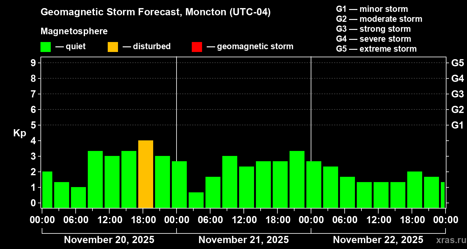 Geomagnetic storm forecast in Moncton for Nov 20, 2025