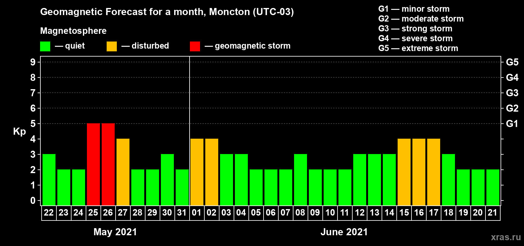Geomagnetic storm forecast in Moncton for May 22, 2021