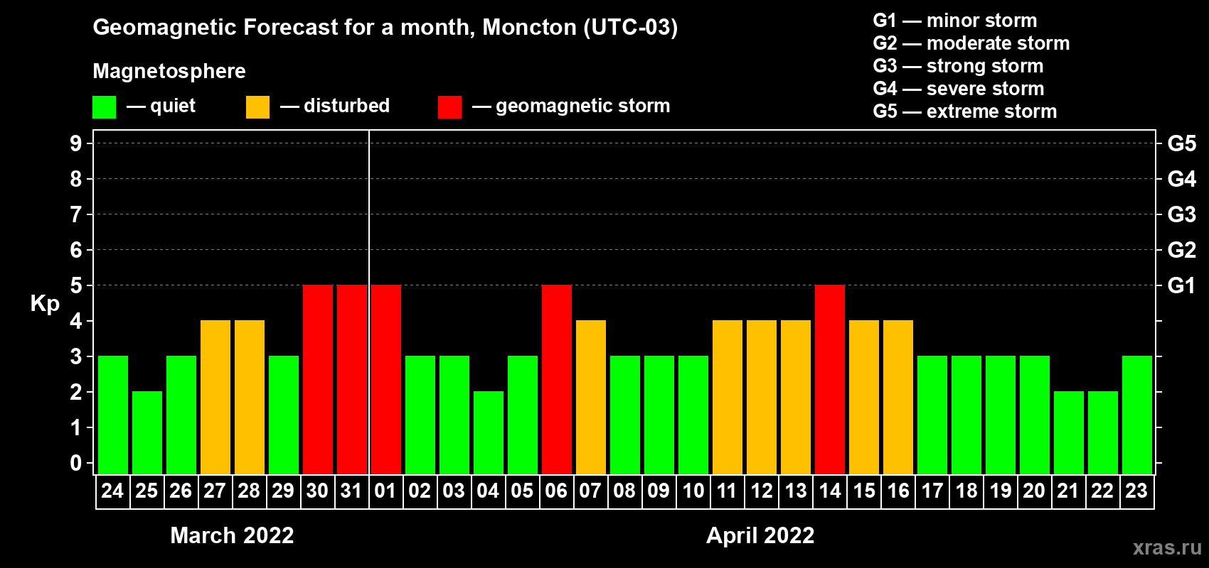 Geomagnetic storm forecast in Moncton for Mar 24, 2022