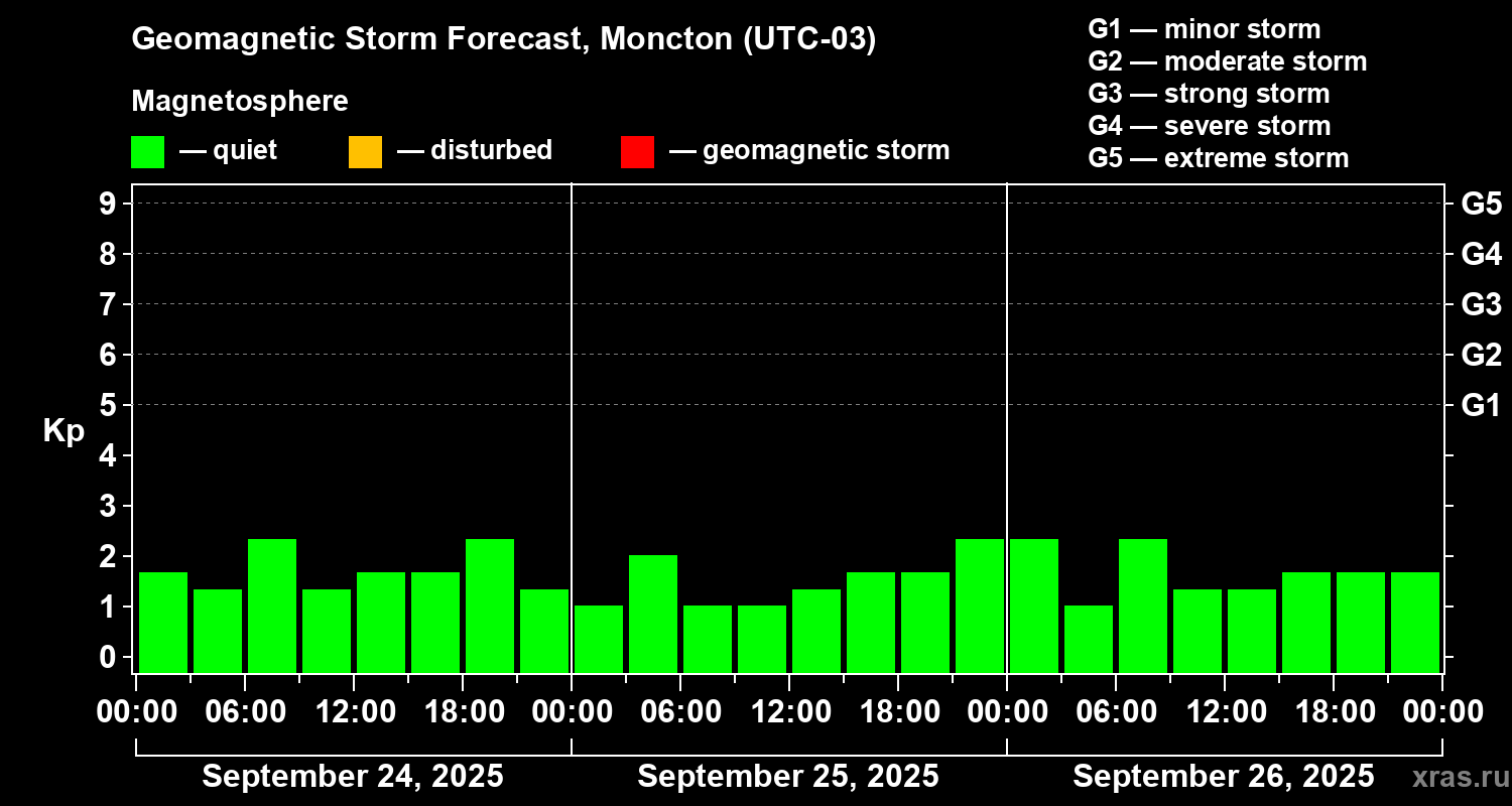 Geomagnetic storm forecast in Moncton for Sep 24, 2025
