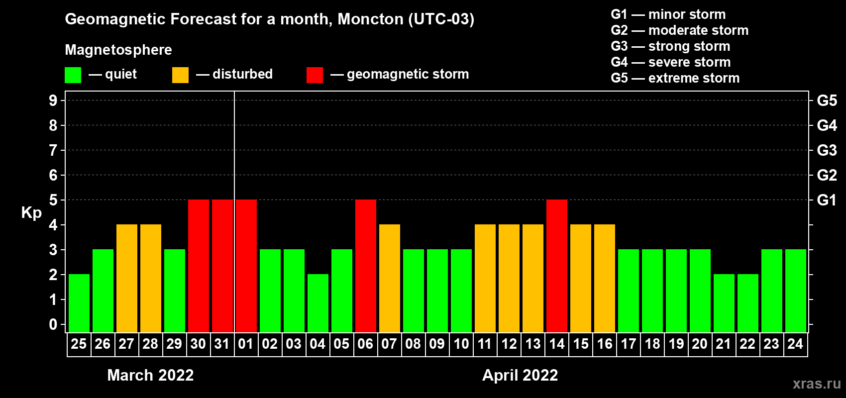 Geomagnetic storm forecast in Moncton for Mar 25, 2022