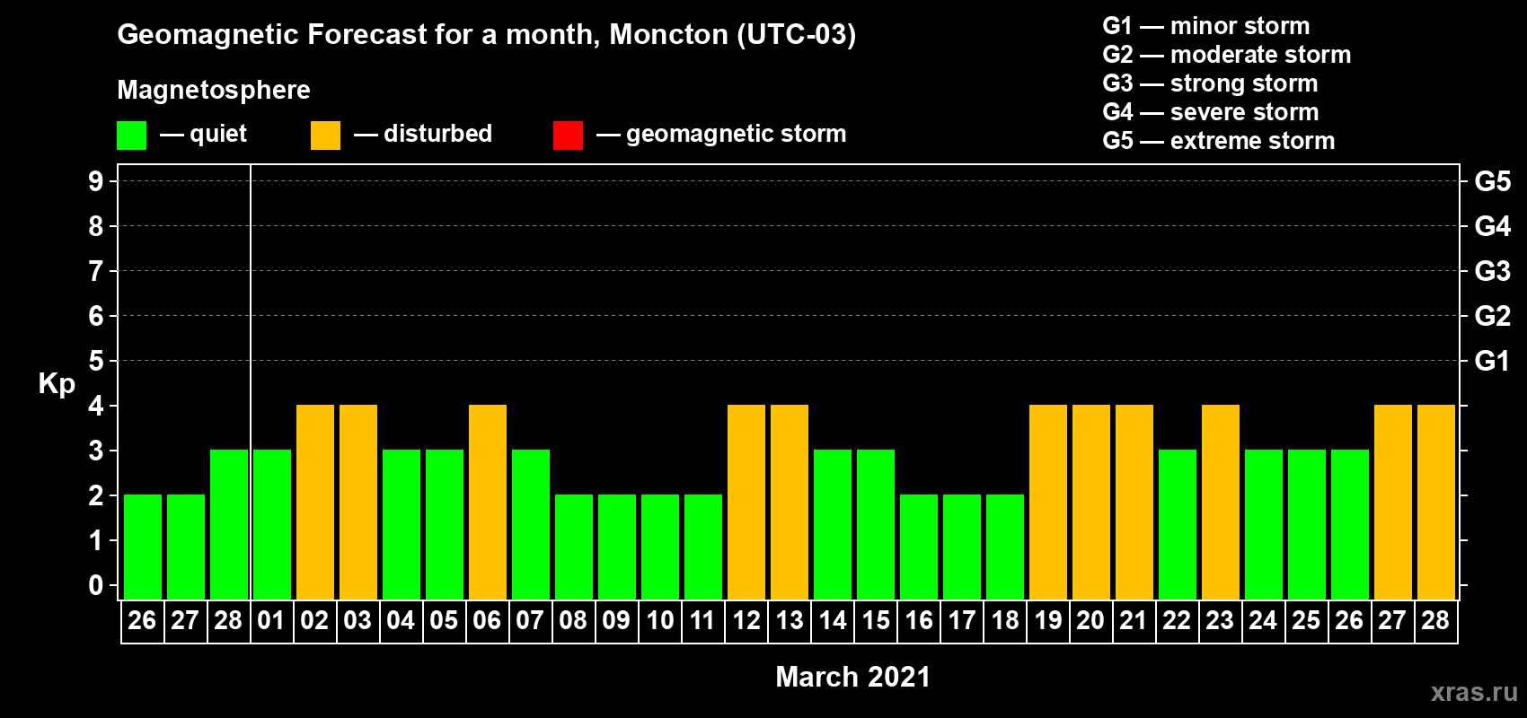 Geomagnetic storm forecast in Moncton for Feb 26, 2021