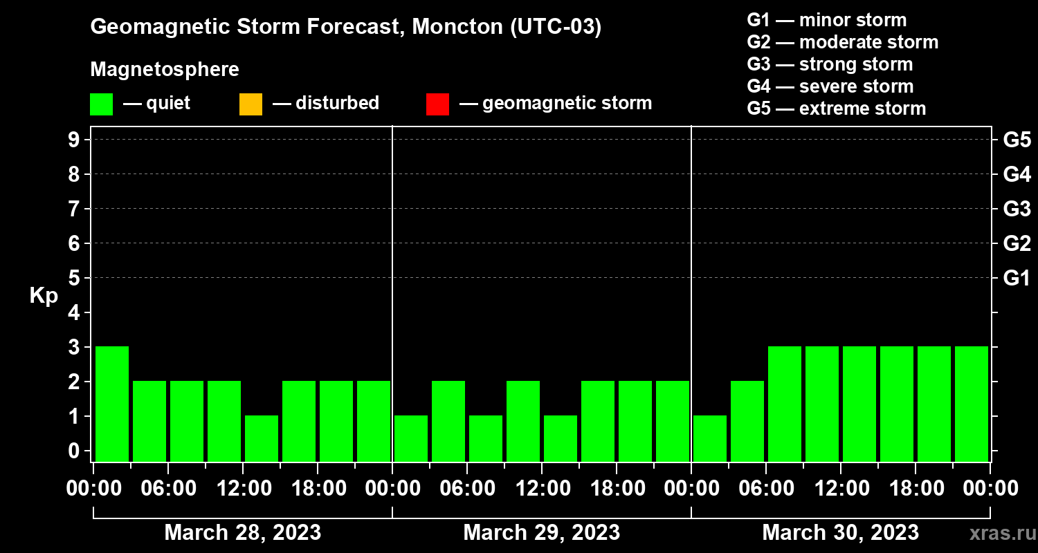 Geomagnetic storm forecast in Moncton for Mar 28, 2023