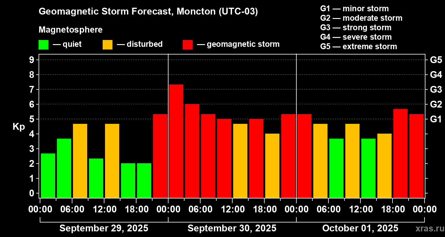 Geomagnetic storm forecast in Moncton for Sep 29, 2025
