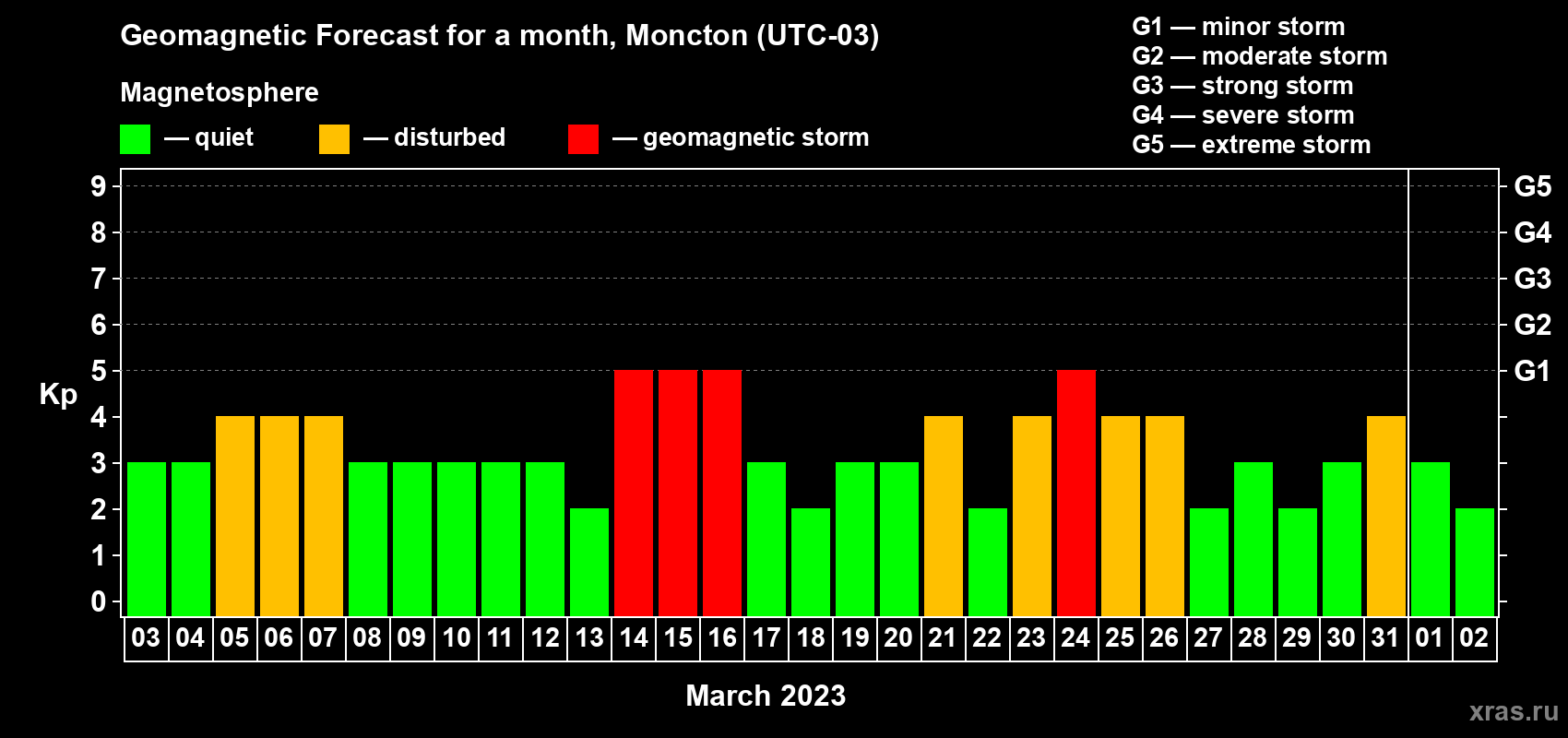 Geomagnetic storm forecast in Moncton for Mar 03, 2023