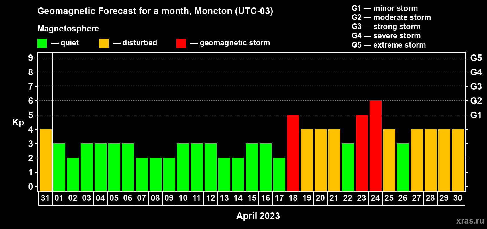 Geomagnetic storm forecast in Moncton for Mar 31, 2023