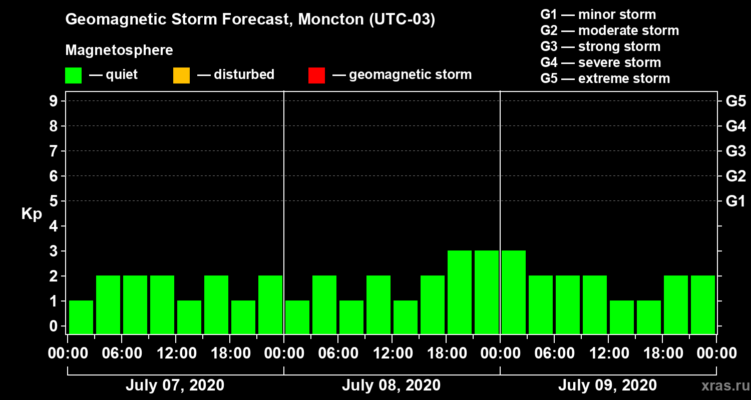 Geomagnetic storm forecast in Moncton for Jul 07, 2020
