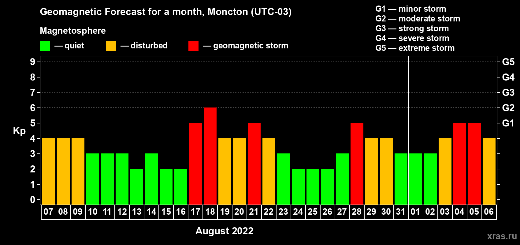 Geomagnetic storm forecast in Moncton for Aug 07, 2022